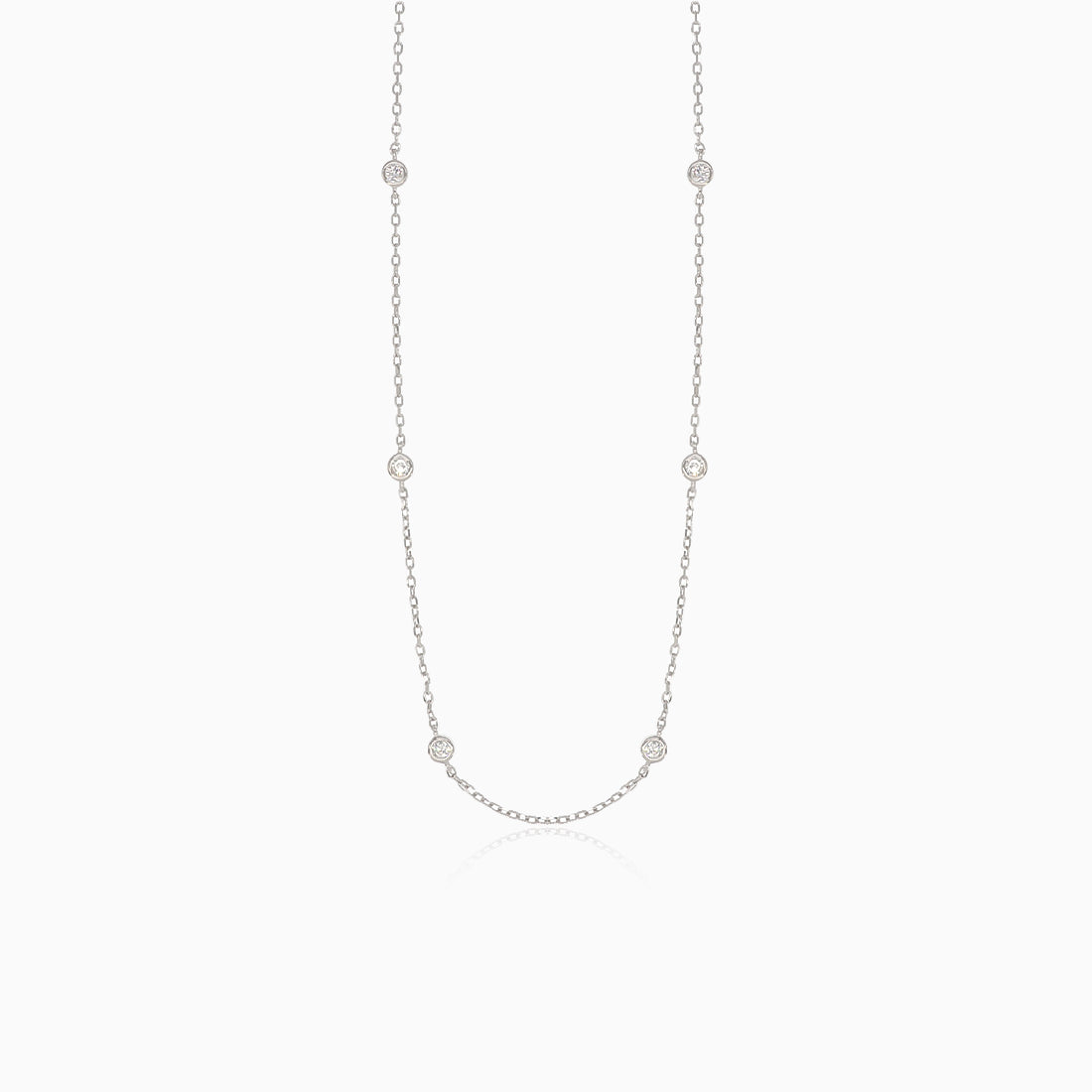 This sophisticated necklace is made from silver. It features simple zircons in a bezel setting. The necklace has a spring ring clasp for easy fastening of the jewelry.