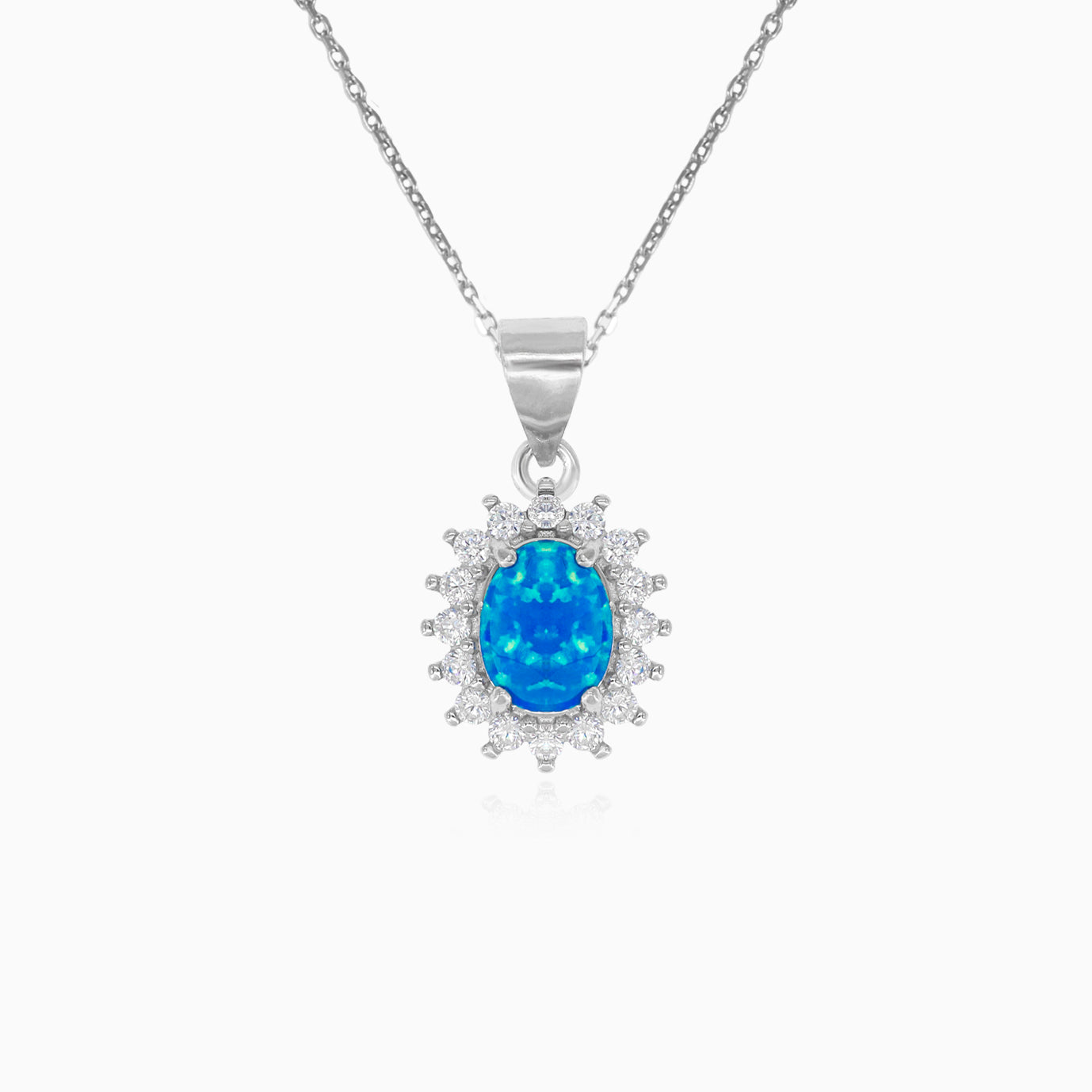 Radiate elegance with this sterling silver pendant featuring a stunning blue opal in oval cut, surrounded by sparkling cubic zirconia in round fine step-cut. The halo royal design with a prong setting exudes sophistication, making it a timeless accessory for any occasion.