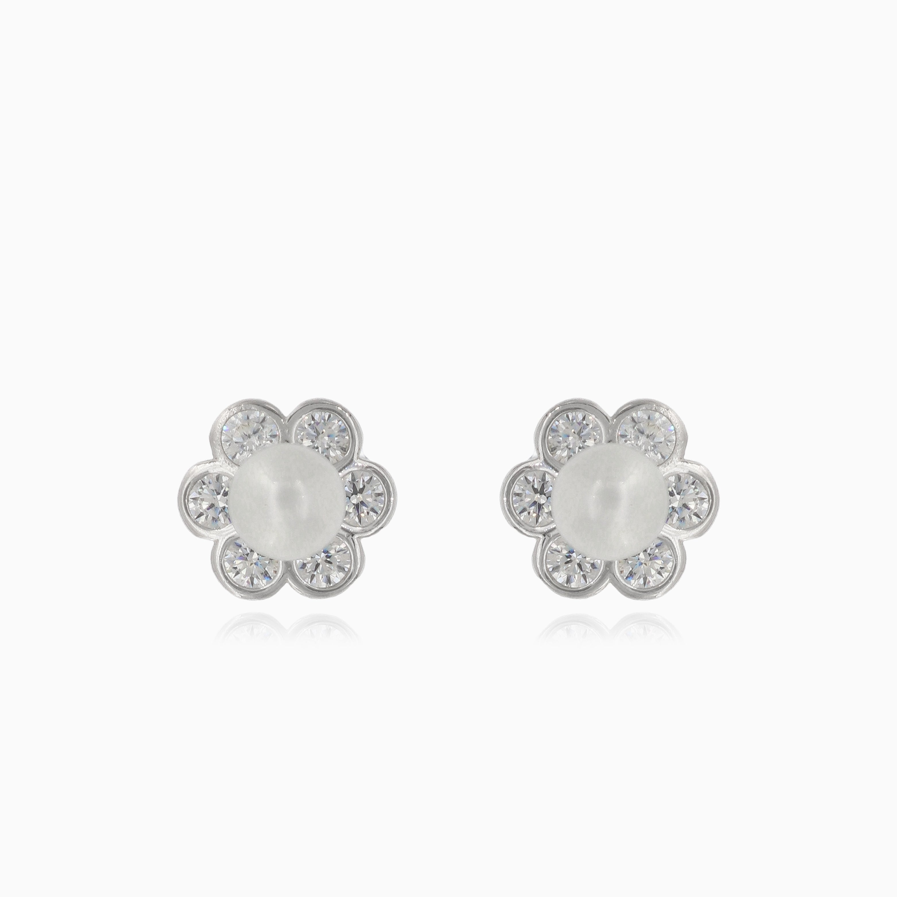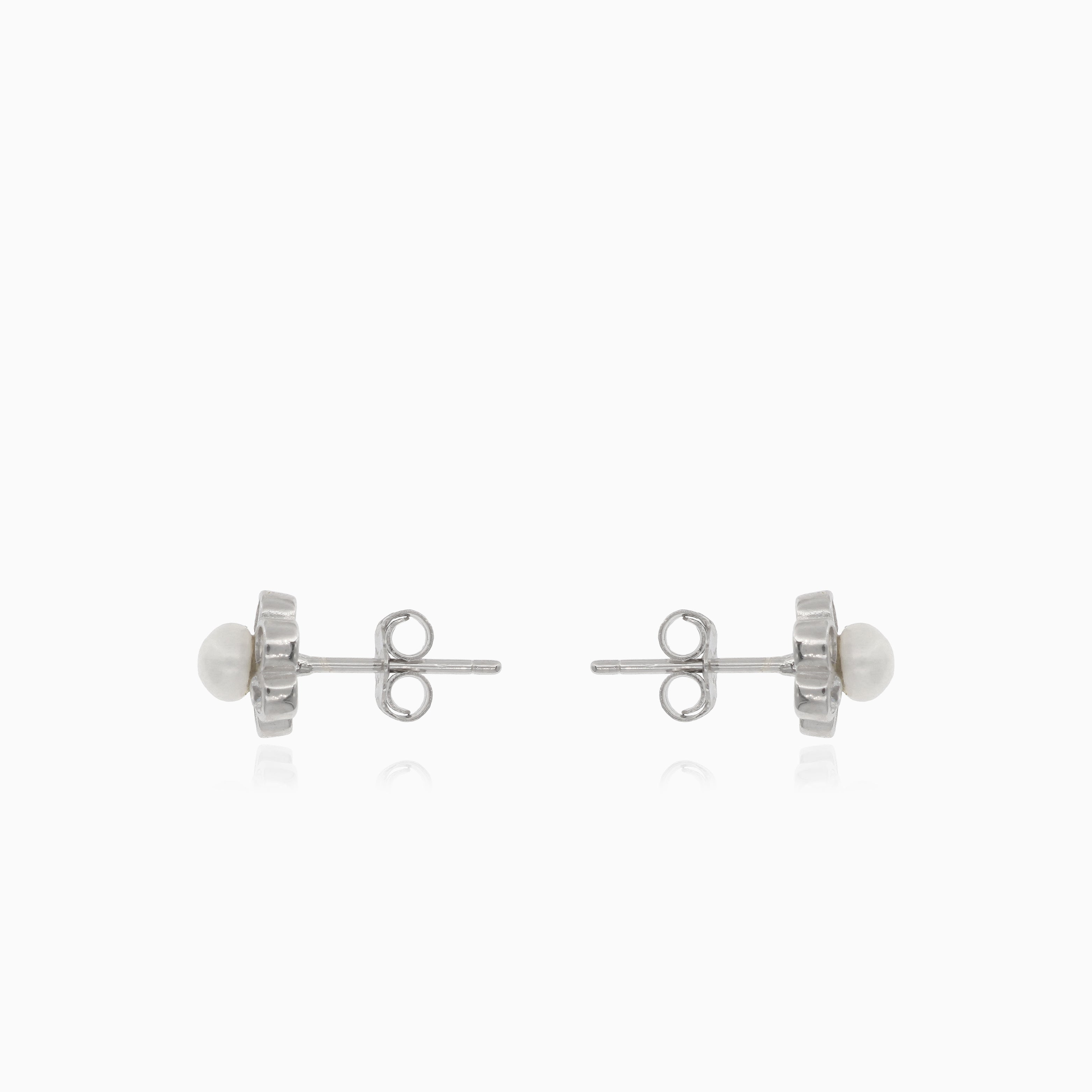 Adorn your ears with elegance wearing these charming silver flower stud earrings embellished with lustrous pearls and shimmering cubic zirconia accents.