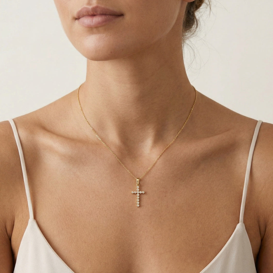 Beautiful 14kt yellow gold cross pendant created from round cut natural cubic zirconia.