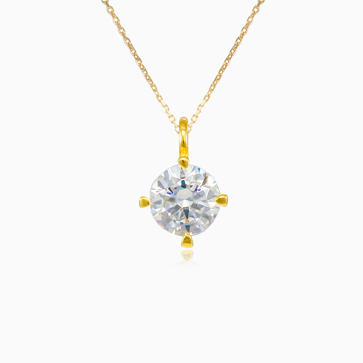 Solitaire round cut cubic zirconia set in 14K yellow gold pendant for necklace protected with 4 prongs.