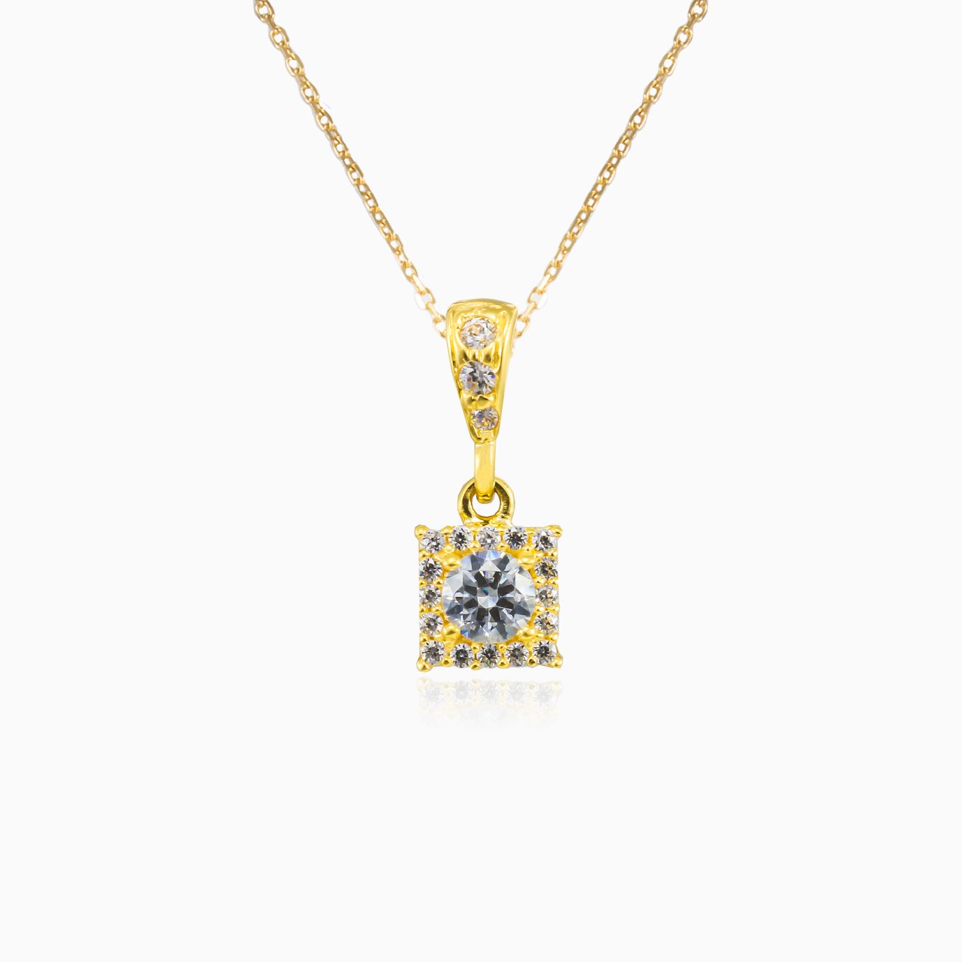 Modern pendant in 14K yellow gold with a square halo and round central cubic zirconia.