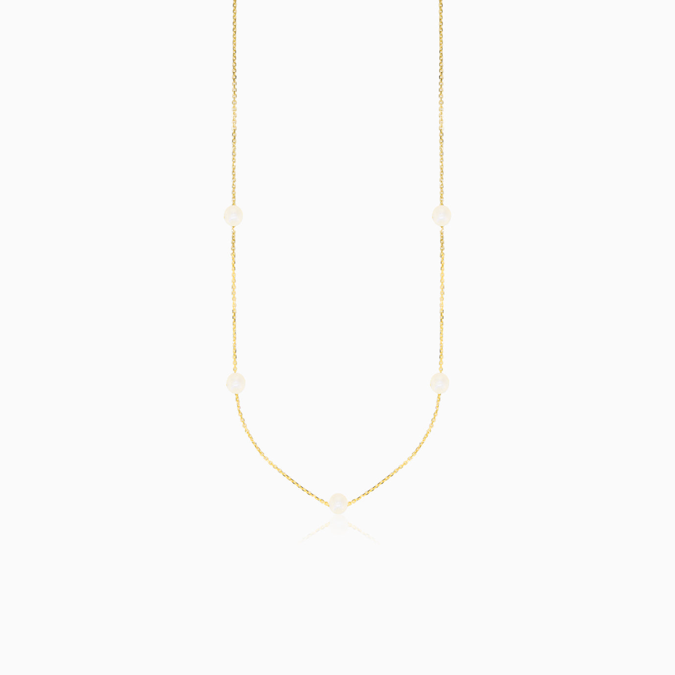 Delicate 14kt yellow gold necklace with five small Australian sweetwater pearls that are fixed on the chain. The necklace has adjustable sizing.