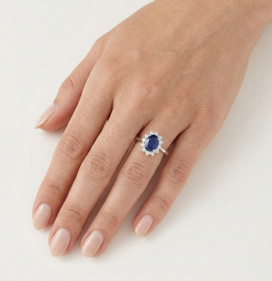 This elegant 14ct white gold ring features a stunning oval-shaped Sapphire with a weight of 1.17 carats. The Sapphire is surrounded by a halo of round-cut diamonds, totaling 0.52 carats, with a clarity grade of VS and a color grade of G. The diamonds form a beautiful crown shape around the Sapphire, adding extra sparkle and brilliance. Crafted with exquisite attention to detail, this ring is a perfect choice for those seeking a unique and luxurious piece of jewelry.