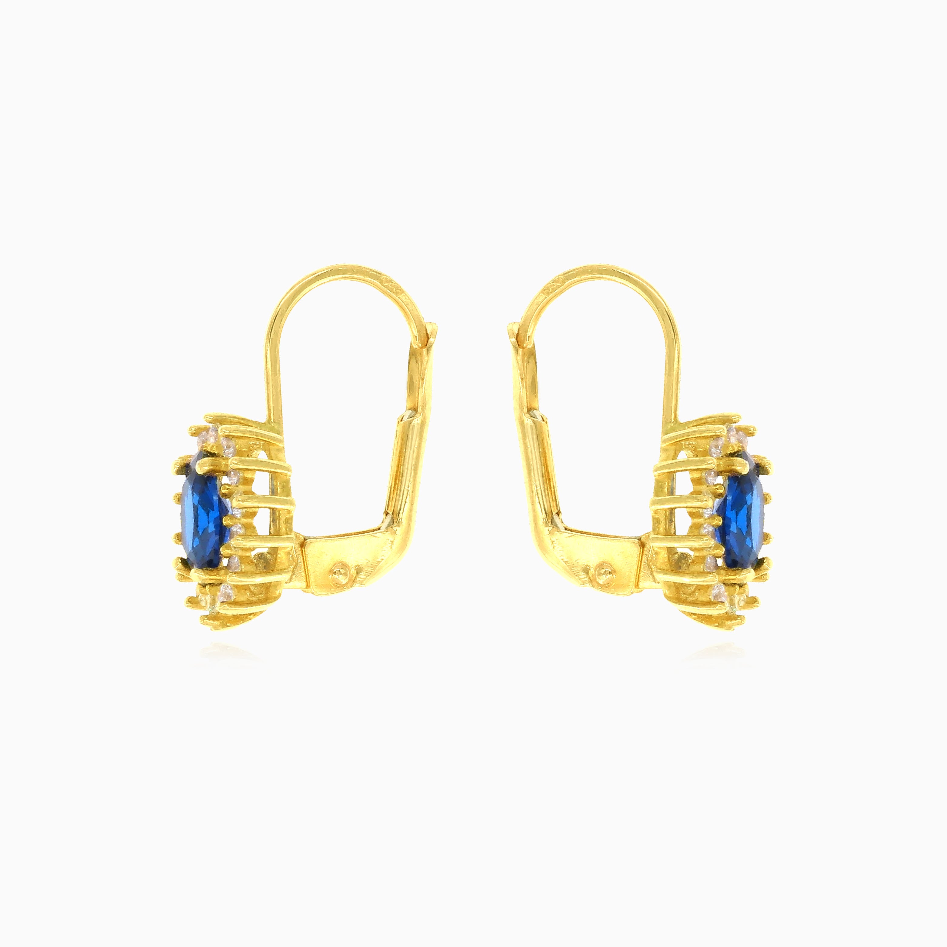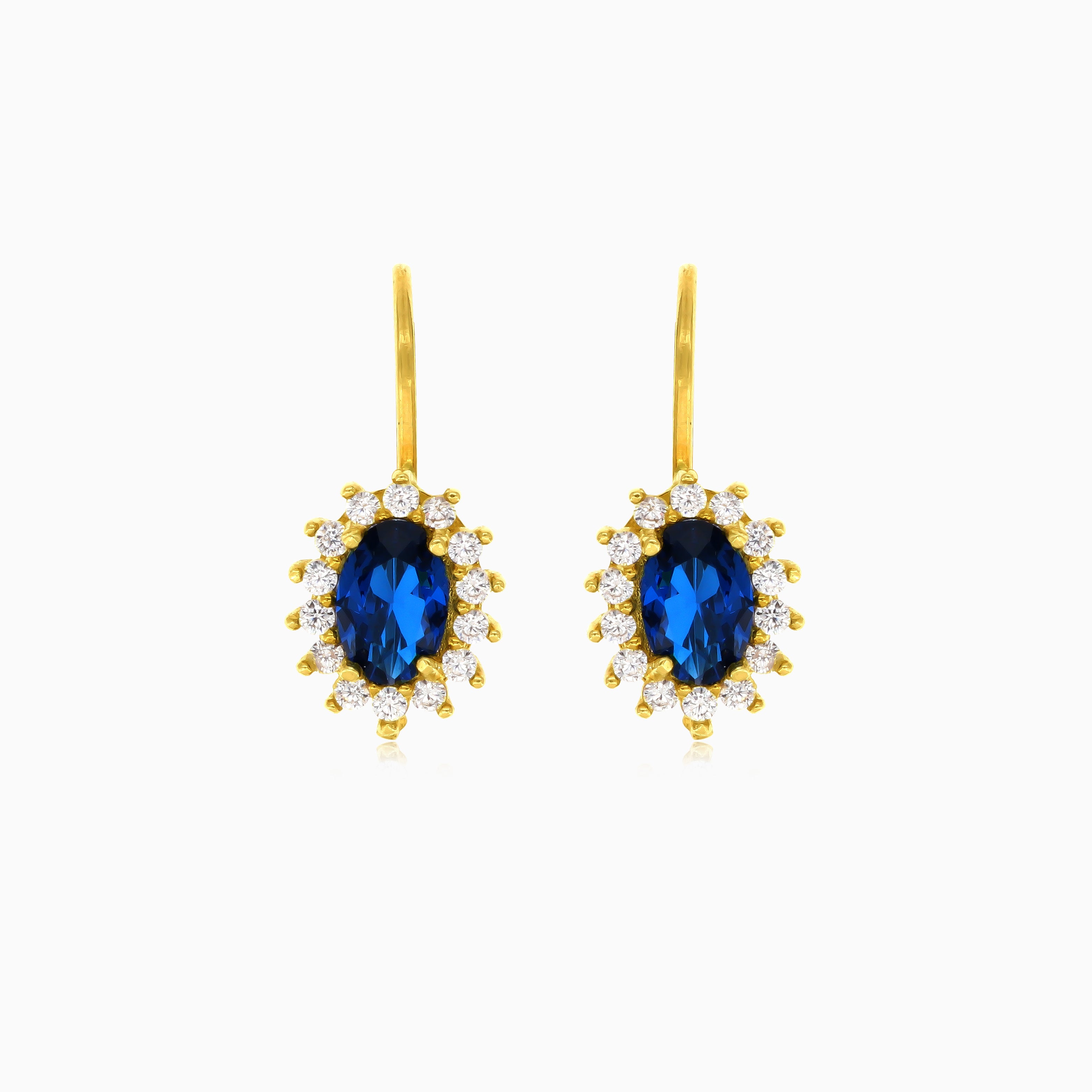 Radiant 14kt yellow gold earrings with a vivid oval-cut synthetic sapphire and round fine step-cut sparkling cubic zirconia. Secured by a chic lever-back closure for timeless elegance.