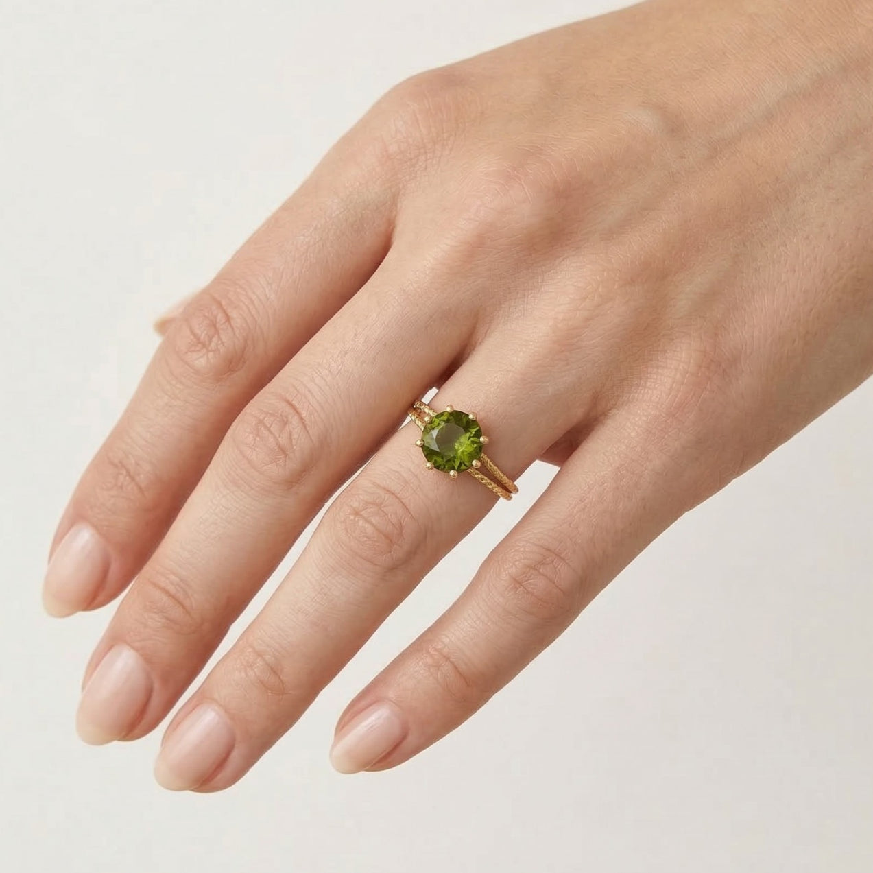 Elevate your style with our women's ring, featuring a round fine step-cut moldavite in 14kt yellow gold with a secure 8-prong setting, creating a mesmerizing and sophisticated accessory.