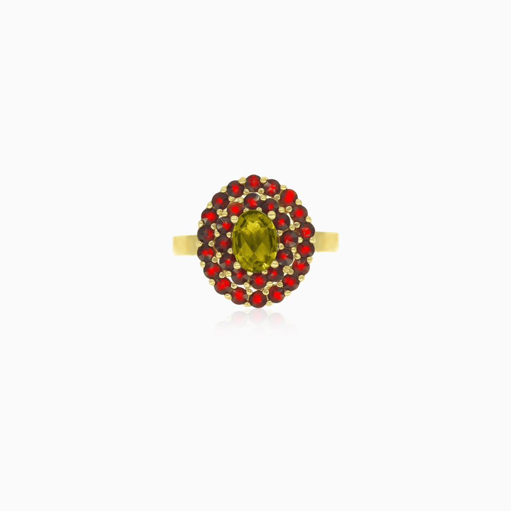 Gemstone duo oval moldavite and round garnet ring