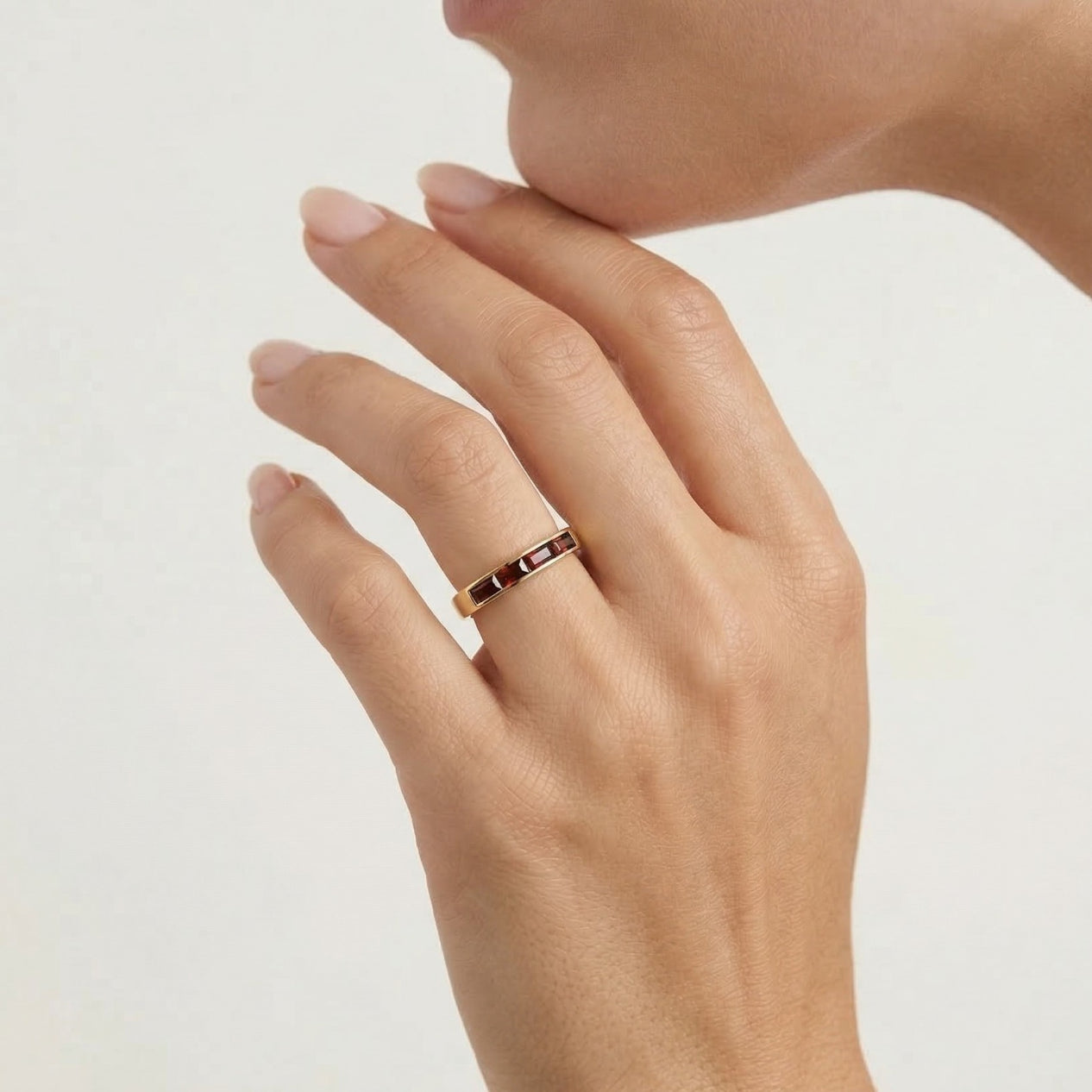 Make a statement with this long 14kt yellow ring featuring exquisite baguette-cut garnets in a secure bar setting, ensures comfort and ease of wear, while the elongated design adds a touch of elegance to any ensemble.