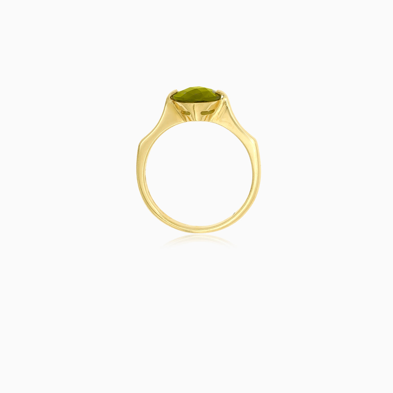 Immerse yourself in celestial charm with this ring featuring moldavite in a round fine step-cut. The bar setting in 14kt yellow gold adds a touch of starlight elegance. Elevate your look with this celestial-inspired jewelry.