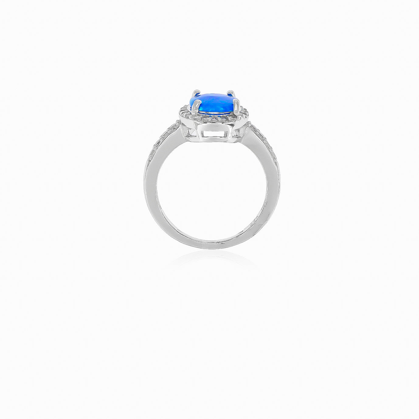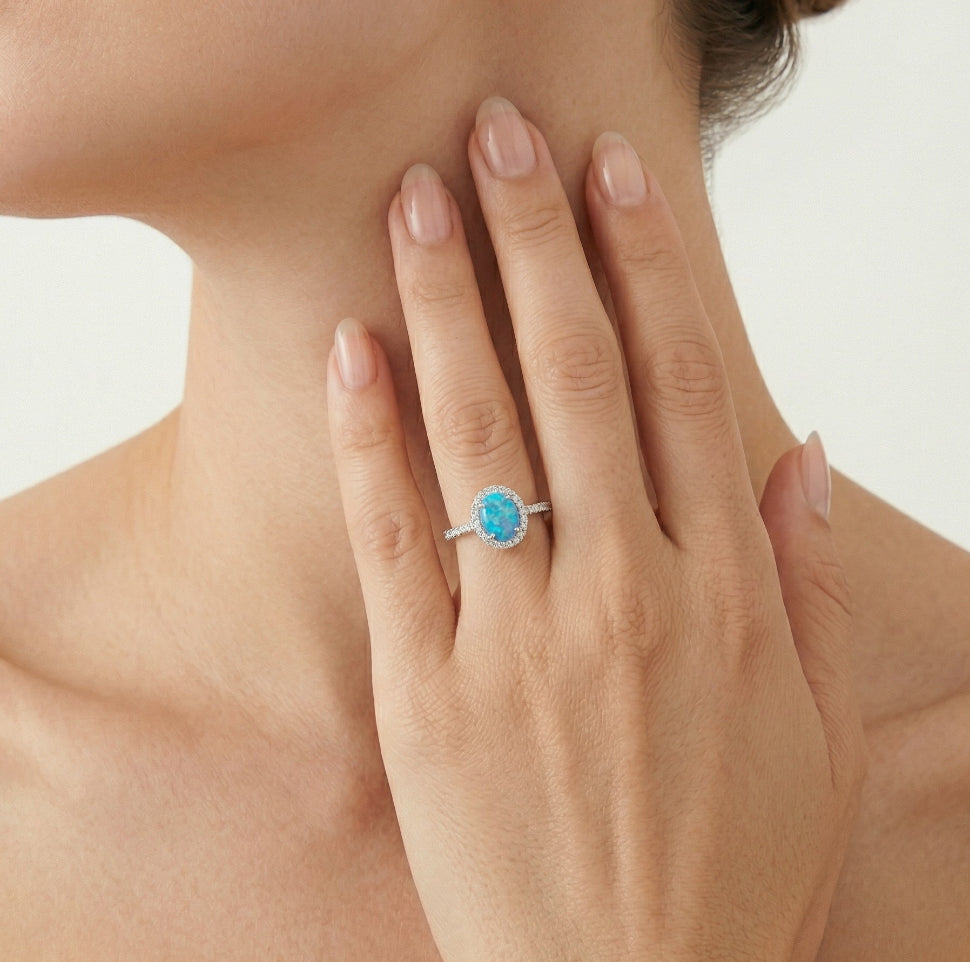 Elevate your style with our women's silver ring featuring a captivating blue opal in cabochon oval-cut, complemented by sparkling cubic zirconia in round fine step-cut, all delicately set in a prong setting.