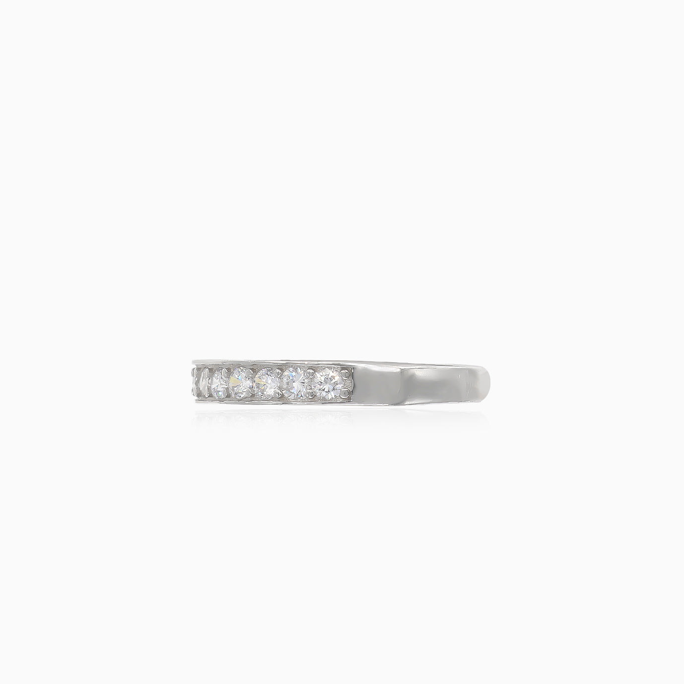 This exquisite silver ring features a row of round cubic zirconia stones, adding a touch of sparkle to your look.