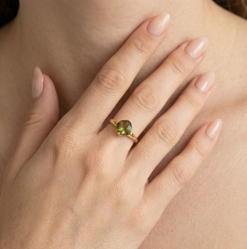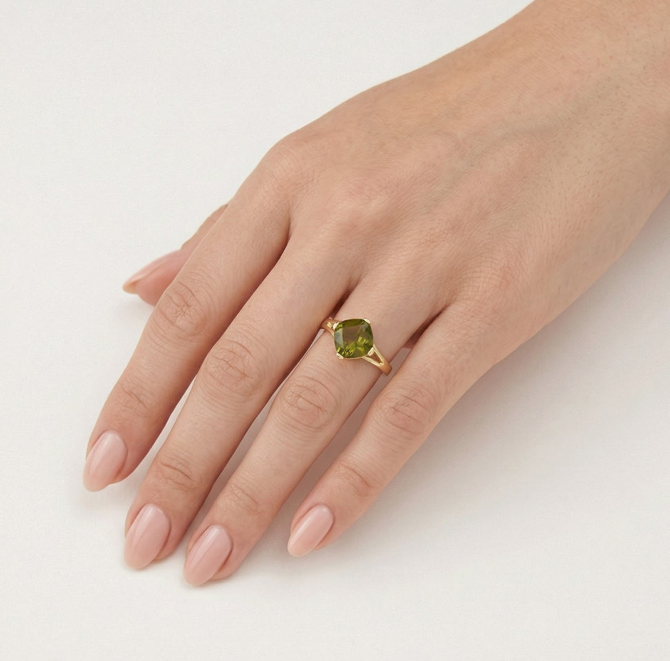 Elevate your style with these 14kt yellow gold ring featuring a modavite stone in a cushion fine step-cut. The prong setting add a modern touch while ensuring both security and comfort.