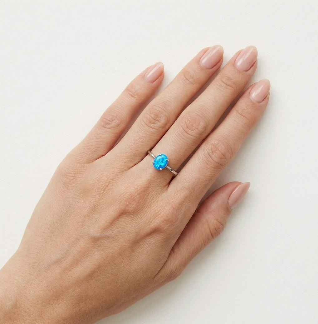 Adorn yourself with our women's silver ring featuring a stunning blue opal in cabochon oval-cut, delicately set in a 4 prong setting, perfect for those who appreciate simplicity.