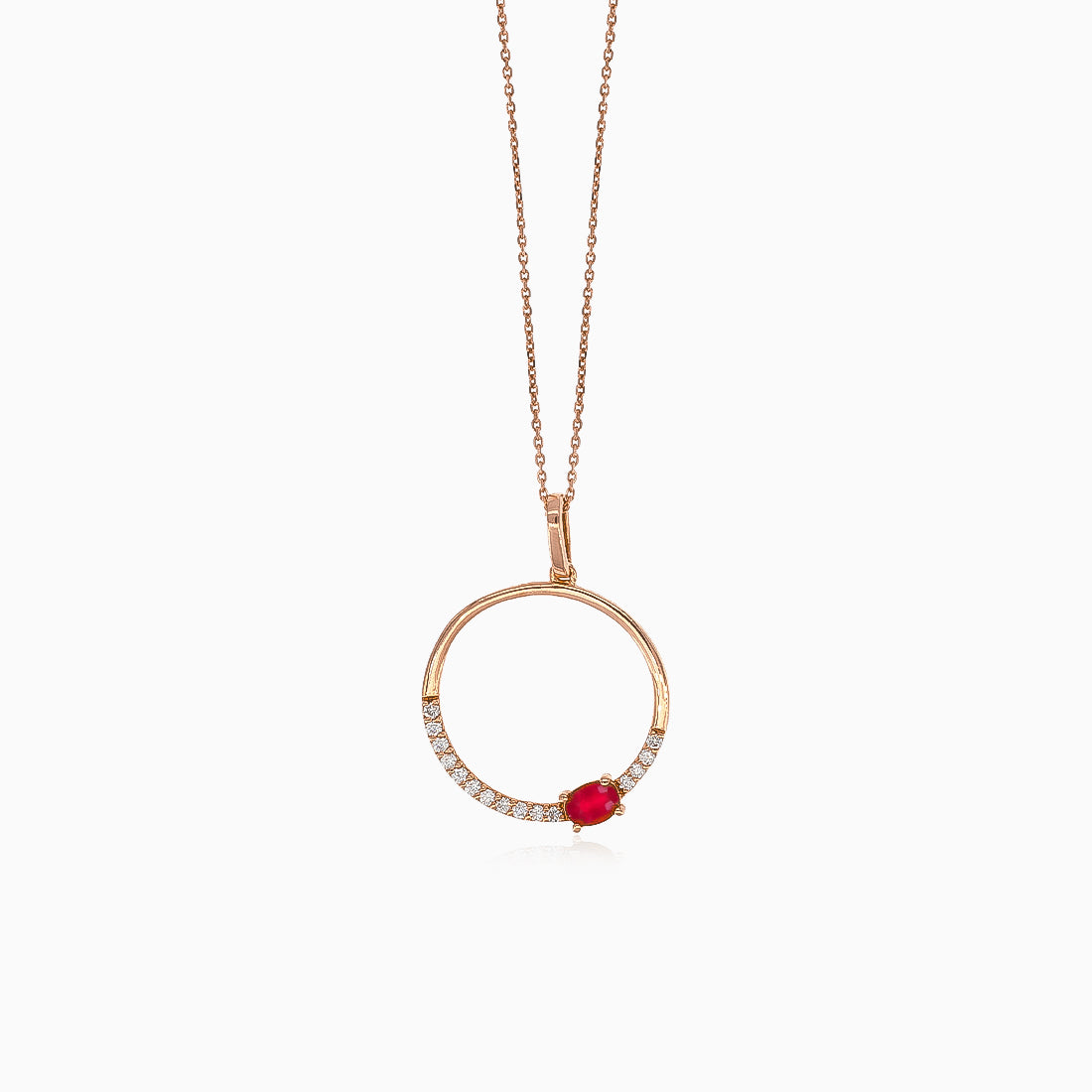 Elevate your look with this stunning women's necklace featuring a diamond in round fine step-cut and a ruby in oval fine step-cut, both set in prong settings. Crafted from luxurious 18kt rose gold, it is secured with a spring ring clasp for easy wear.