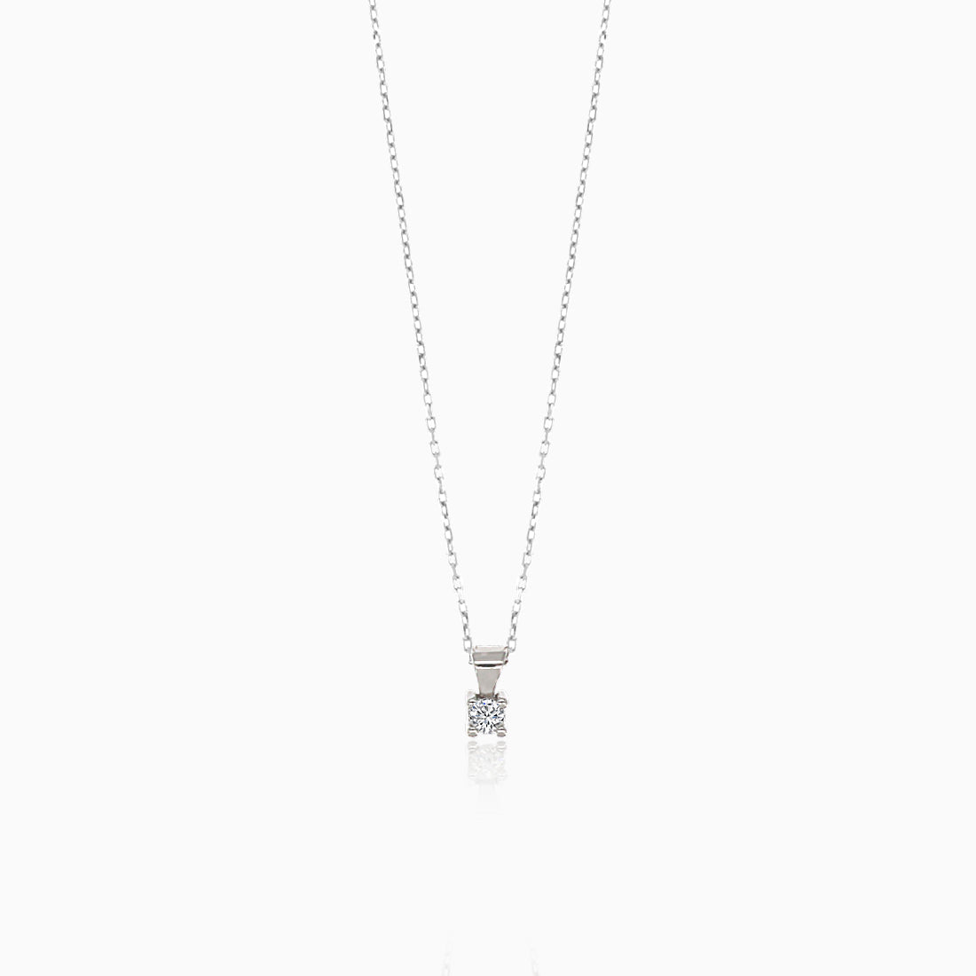 A minimalist 14ct white gold necklace showcasing a solo 0.17ct SI G diamond in a 4 prong setting. Secured with a spring ring clasp closure.