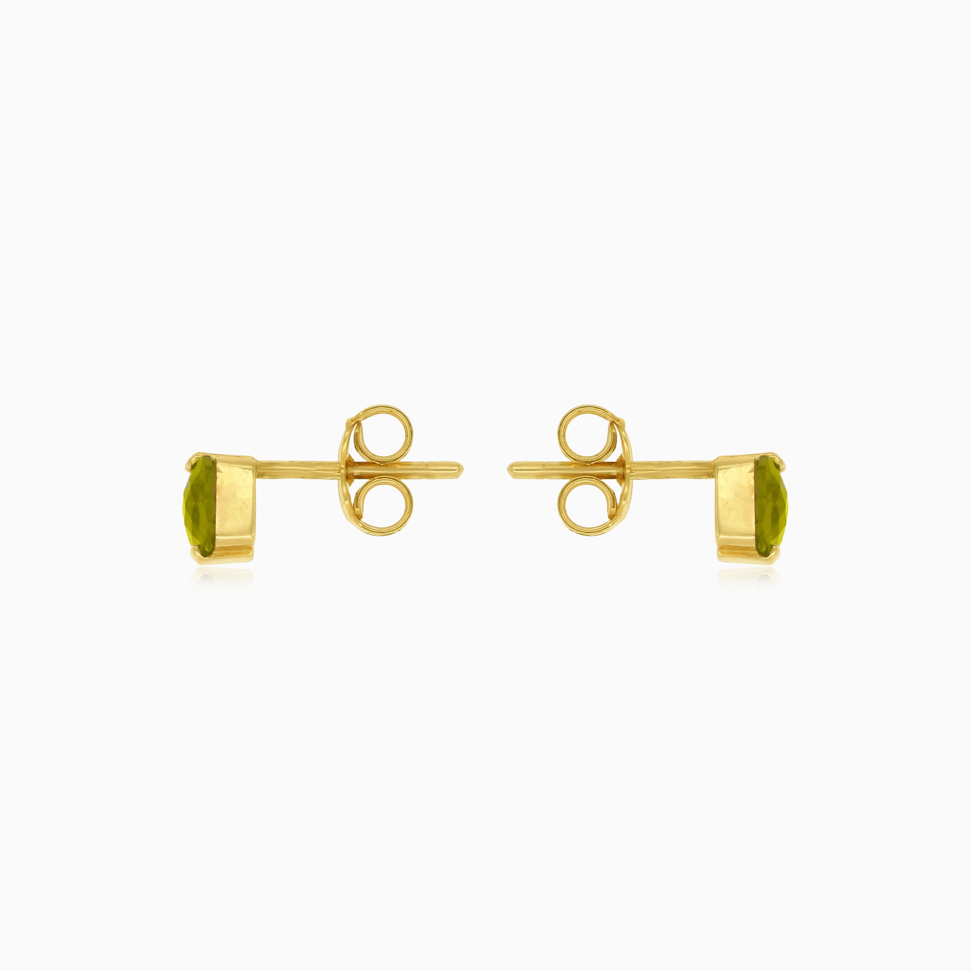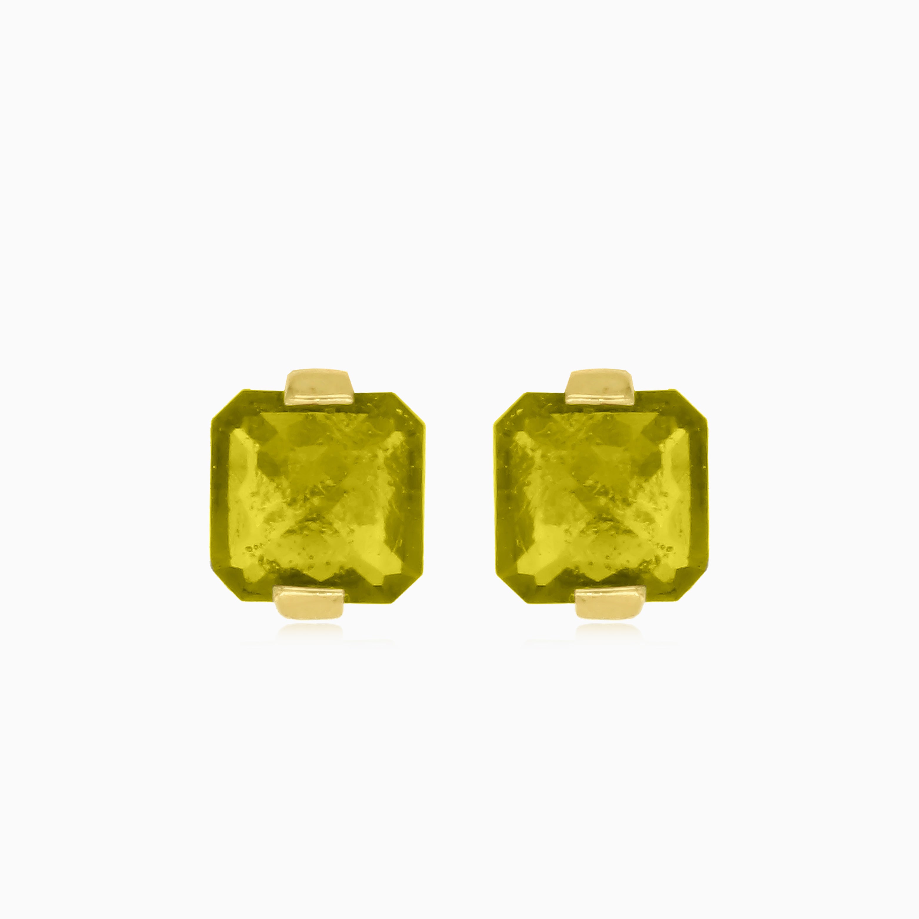 Elevate your style with these exquisite 14kt yellow gold stud earrings featuring cushion fine step-cut moldavite stones. The green gems are elegantly set in a bar setting with stud poussete closure, creating a sophisticated and timeless accessory.