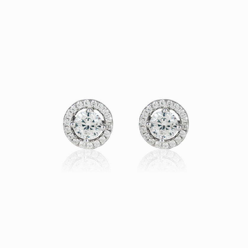 Royal halo earrings in sterling silver with big round cut cubic zirconia in the center and halo of cubic zirconia.
