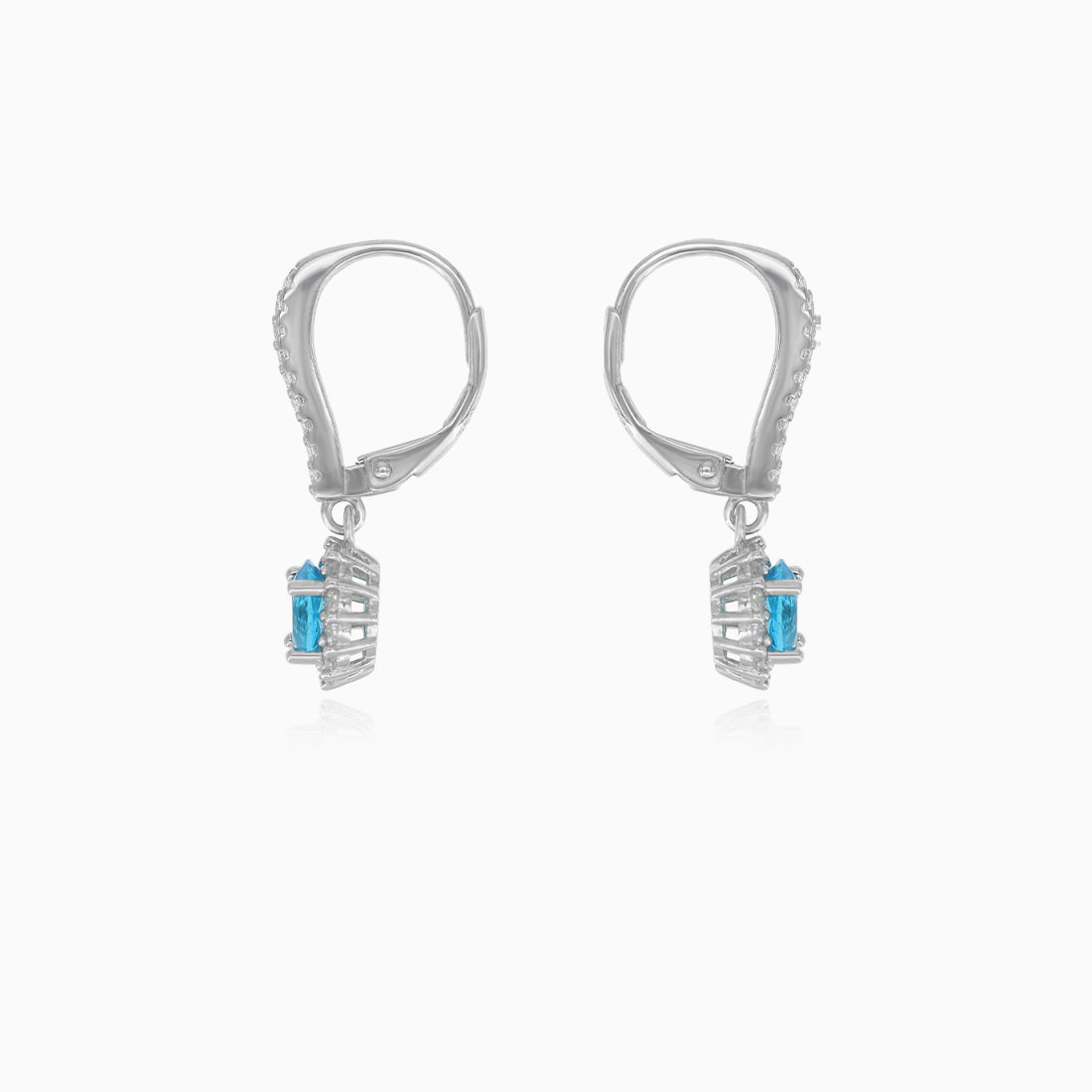 These stunning sterling silver dangling earrings feature vibrant blue topaz in a round fine step-cut, encircled by cubic zirconia for a radiant halo effect. Secured with lever back closures and prong setting, they combine elegance and charm, making them perfect for both casual and formal occasions.
