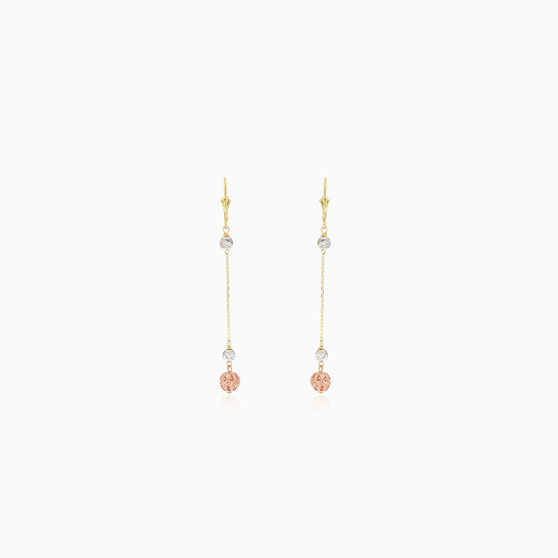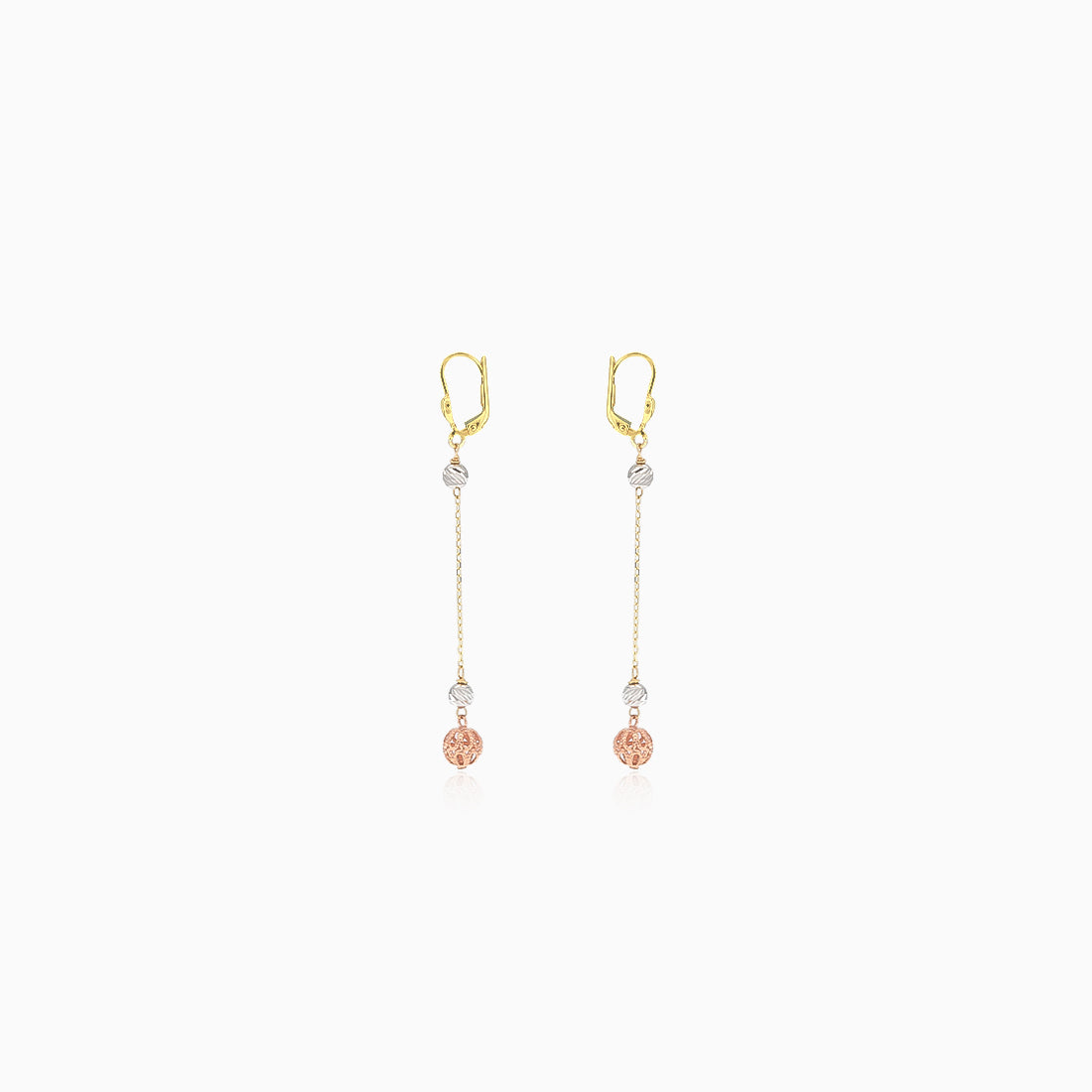Elegantly crafted from 14kt tri-coloured gold, these dangle earrings feature delicate chains adorned with sandblasted white gold beads and intricately carved rose gold beads. The design is complemented by an English patent fastening for a secure fit.