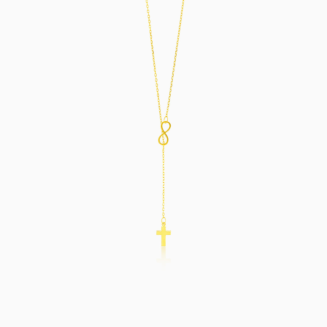 Meticulously crafted from 14kt gold, this necklace features an infinity symbol leading to a delicate chain and culminating in a graceful cross. It is secured with a spring ring clasp.
