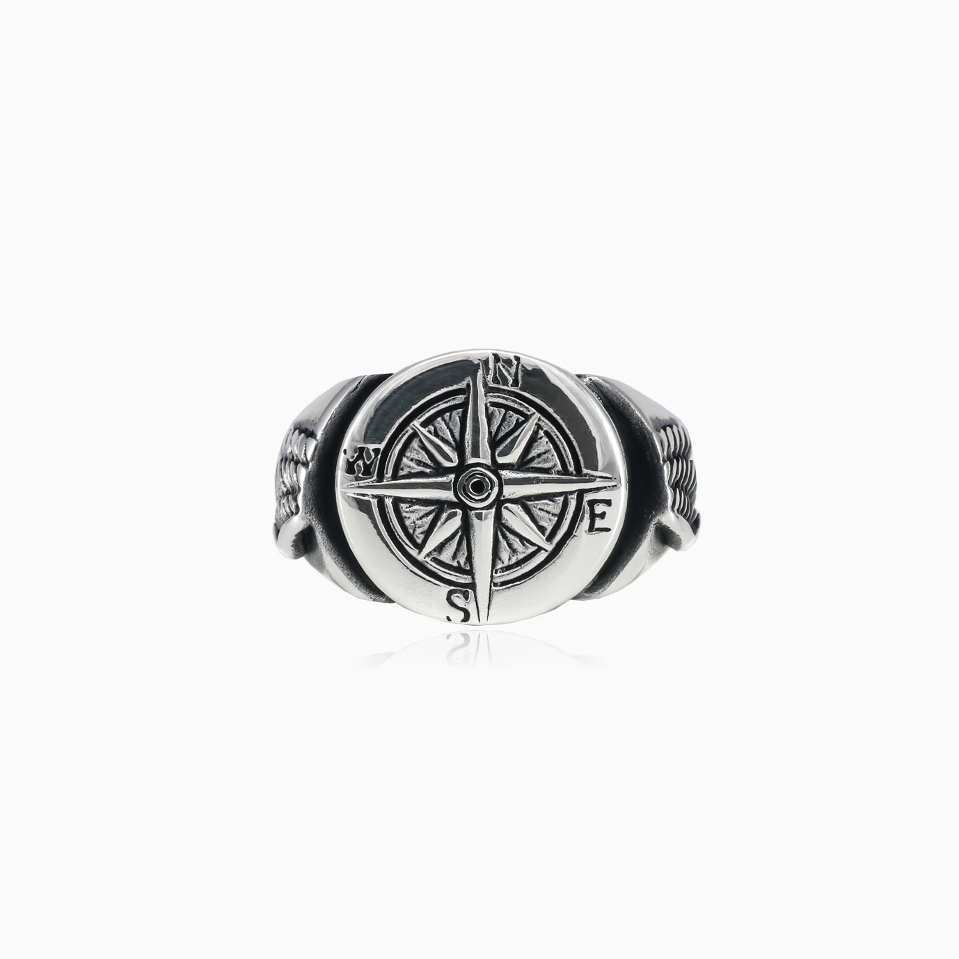 A bold sterling silver men ring featuring a finely sculpted wind rose at the center, framed by detailed wings that flow along the sides for a dynamic and symbolic design. The combination of direction and flight creates a powerful statement piece that represents guidance, freedom and inner strength. Crafted with a solid and bulky profile, it brings striking presence and meaningful artistry to any personal style.
