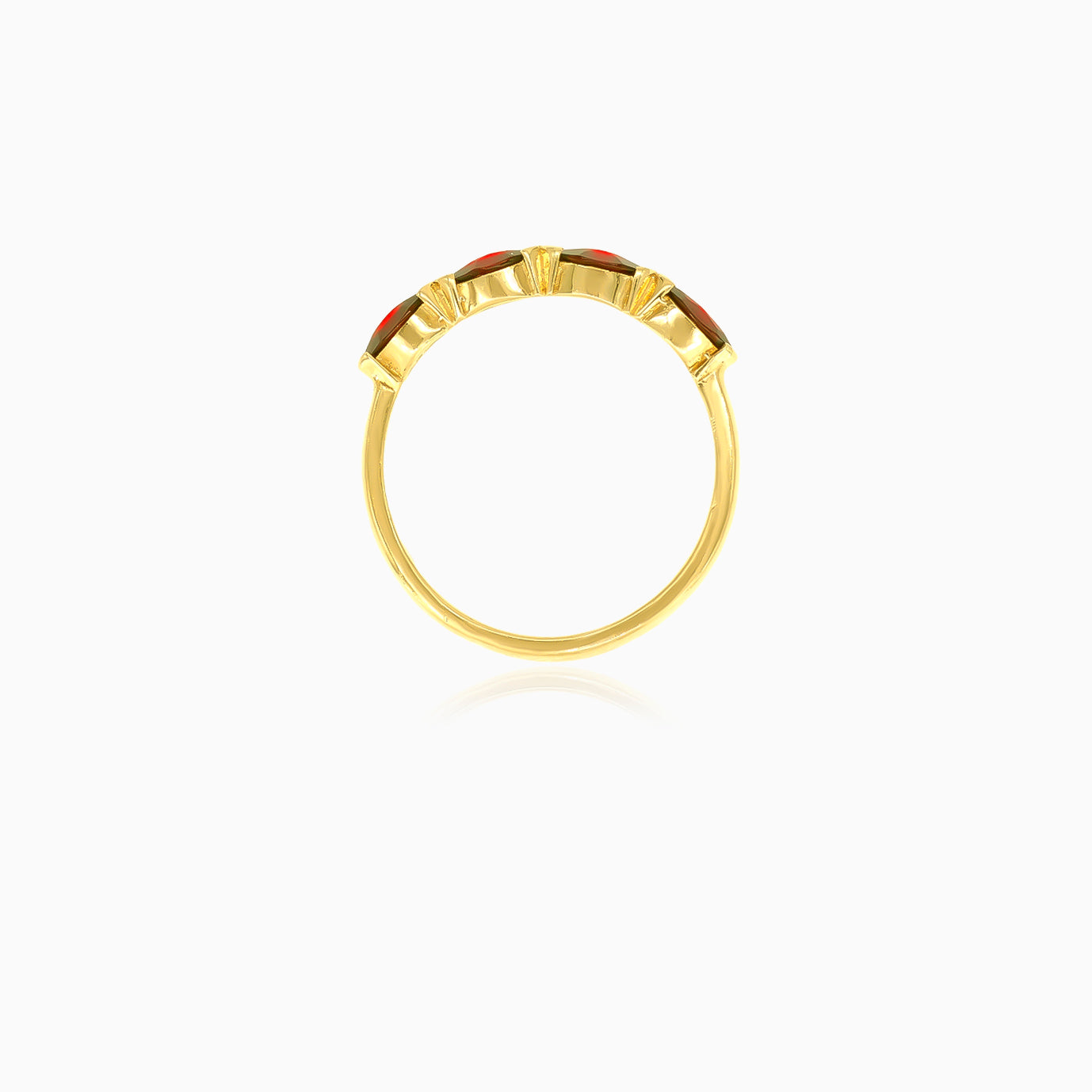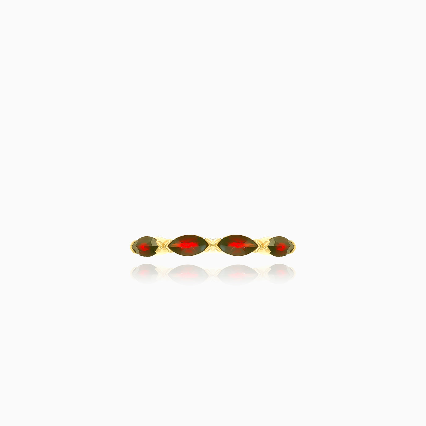 This elegant women’s ring is crafted from 14kt yellow gold, featuring marquise-cut garnets beautifully set around the band in a secure semi bezel setting. The deep red garnets offer a vibrant contrast to the rich gold, making this ring a stunning statement piece perfect for any occasion.