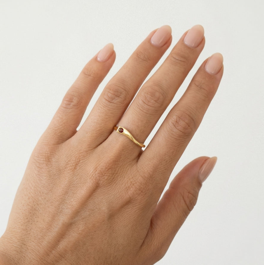 This elegant 14kt yellow gold ring showcases a stunning round fine step-cut garnet, set in a secure bezel setting. The intricate simple and stylish design look gives it a unique, handcrafted appeal, perfect for those who love modern jewelry.