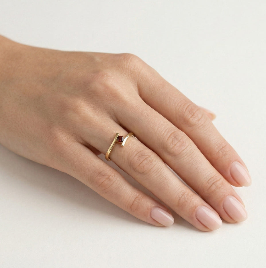 Unique garnet ring with tension setting