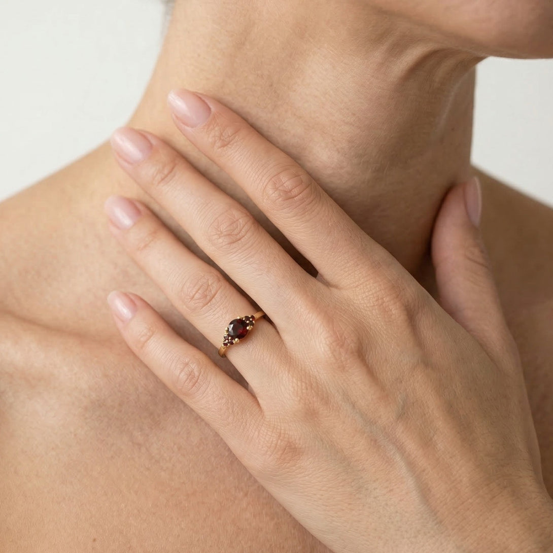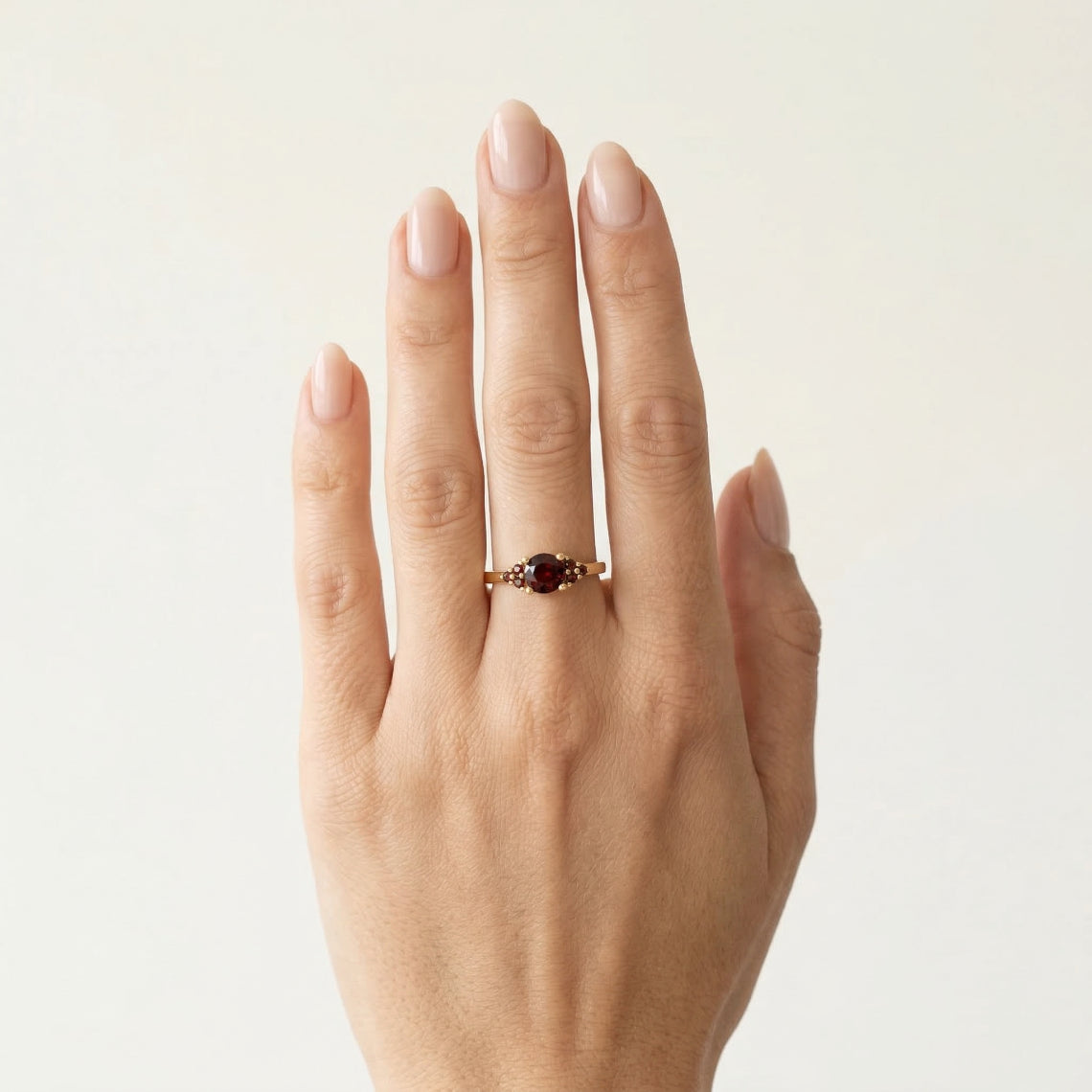 Elevate your style with this elegant women's ring crafted from 14kt yellow gold, featuring a stunning garnet in round fine step-cut, delicately held in a shared prong setting, exuding timeless sophistication.