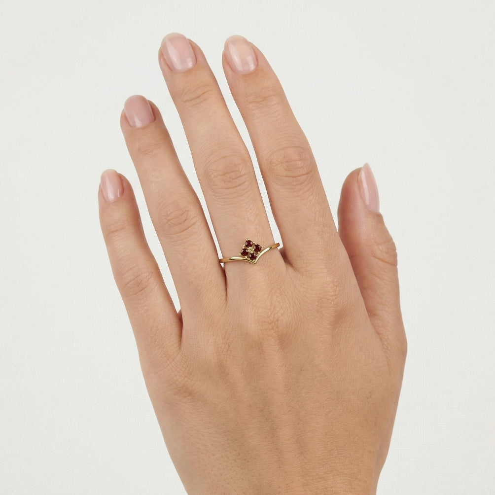 A beautiful women's ring in 14kt yellow gold, featuring four garnet stones in round fine step-cut. The gemstones are securely held in a classic prong setting, offering a timeless and elegant look. Perfect for those who love a touch of sophistication with the fiery allure of garnets.