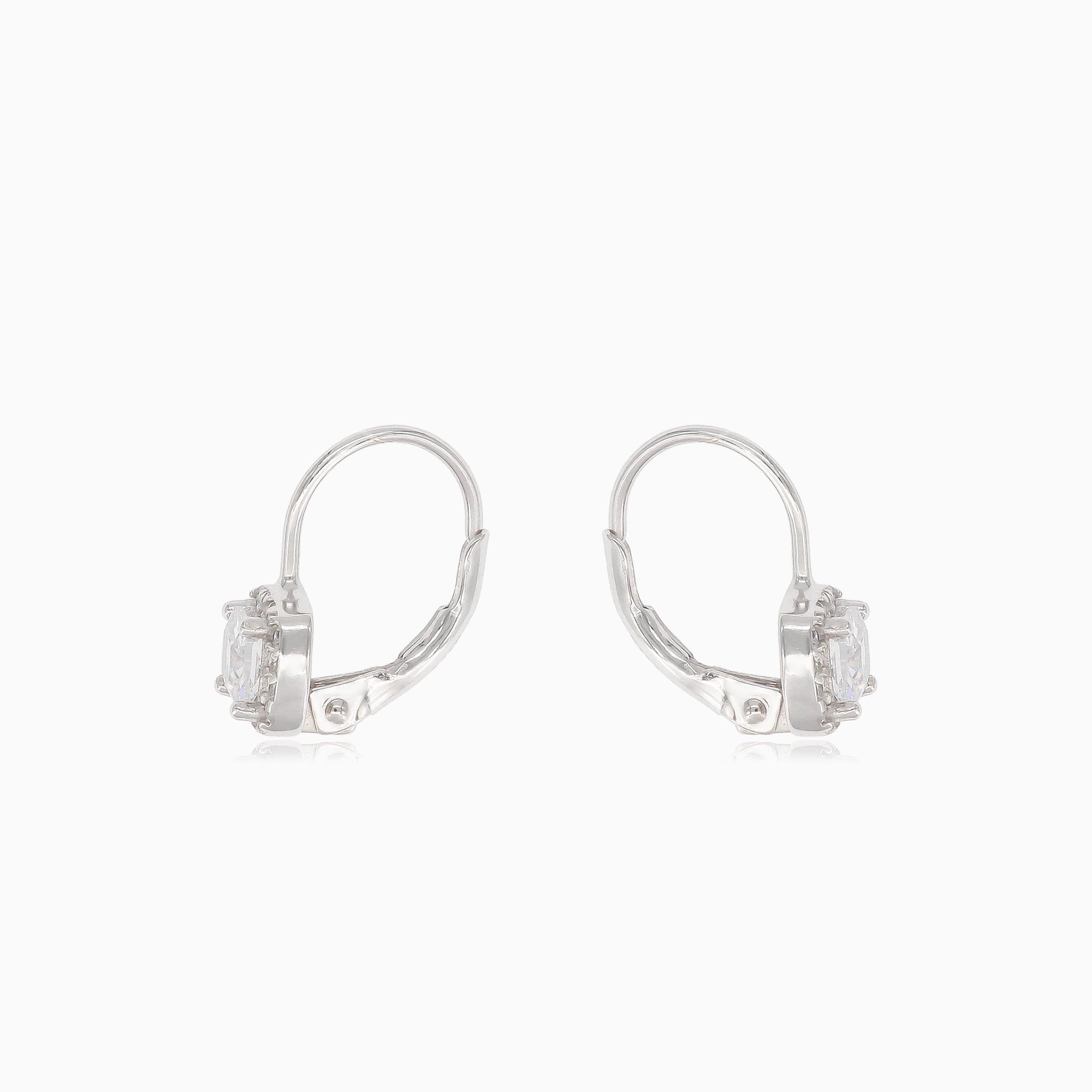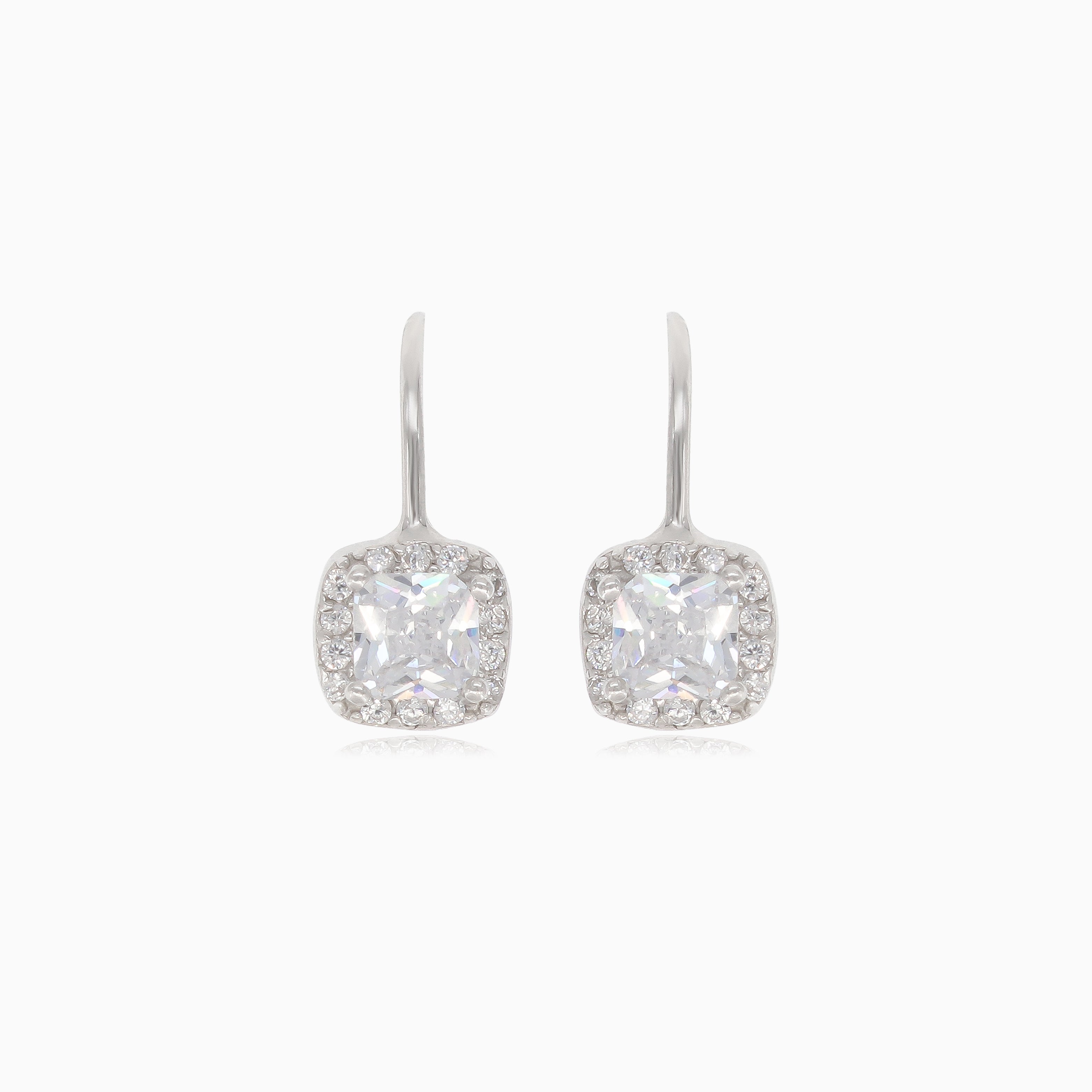 Elegant silver drop earrings featuring a square cubic zirconia stone complemented by smaller round cubic zirconia stones, secured with lever back closures.