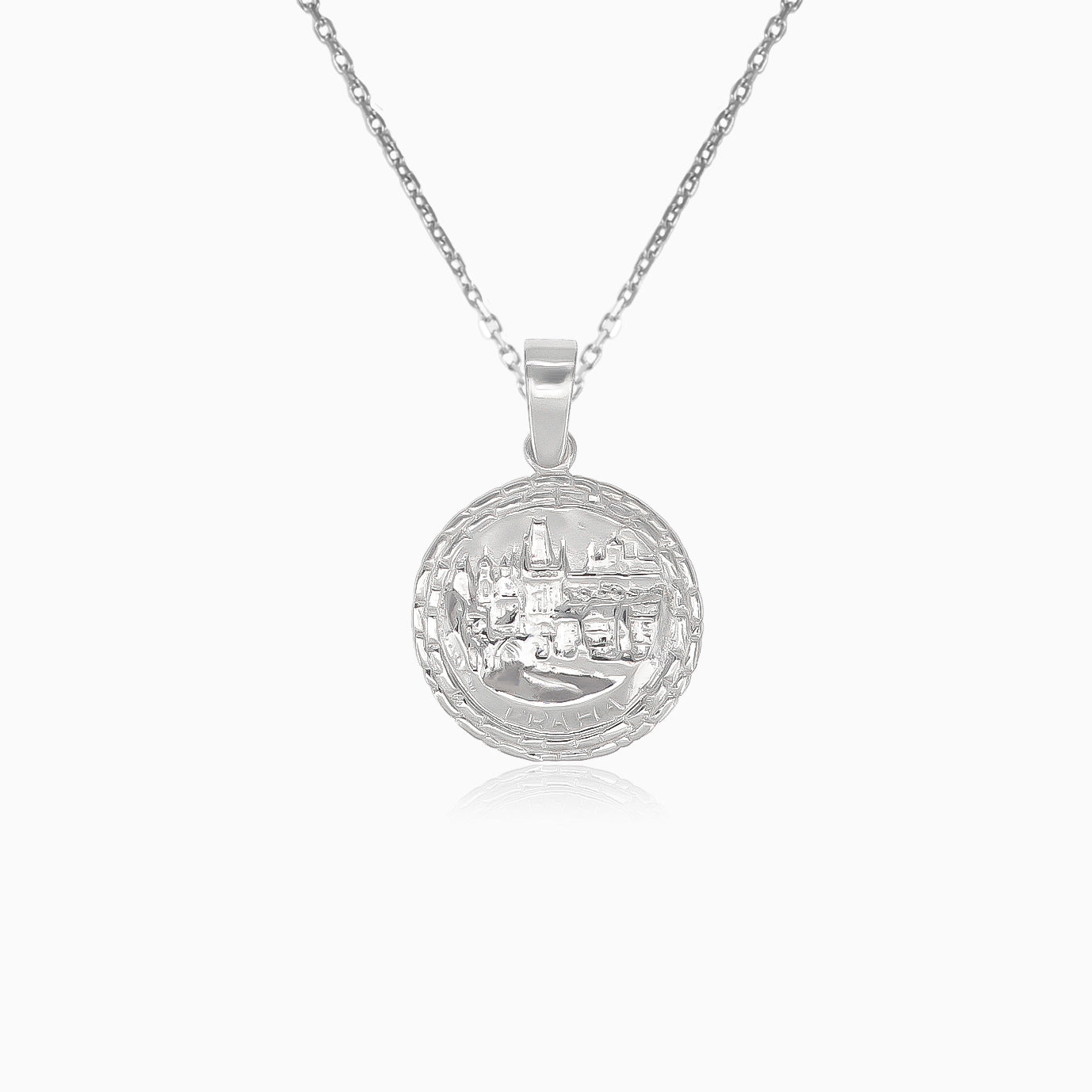 This Silver pendant features an intricate engraving of Prague enclosed within a circle, celebrating the beauty and charm of the historic city.