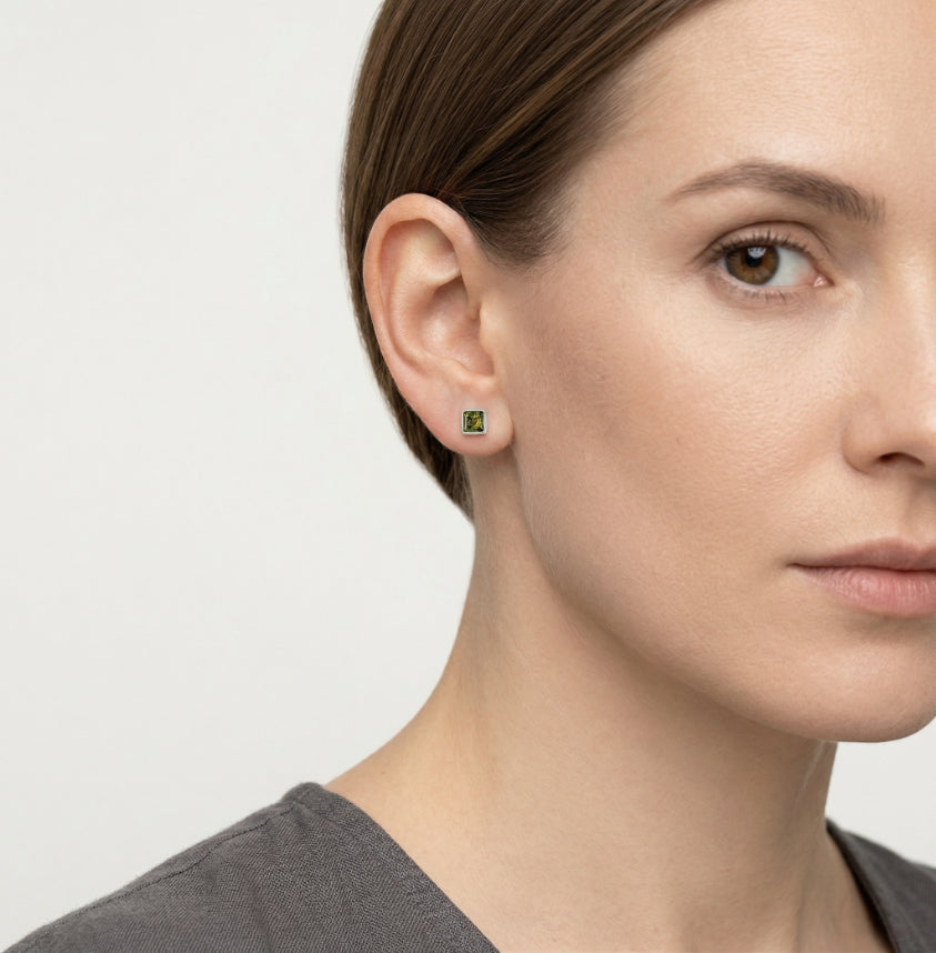 Simple sterling silver earrings for women combined with square cut green amber.