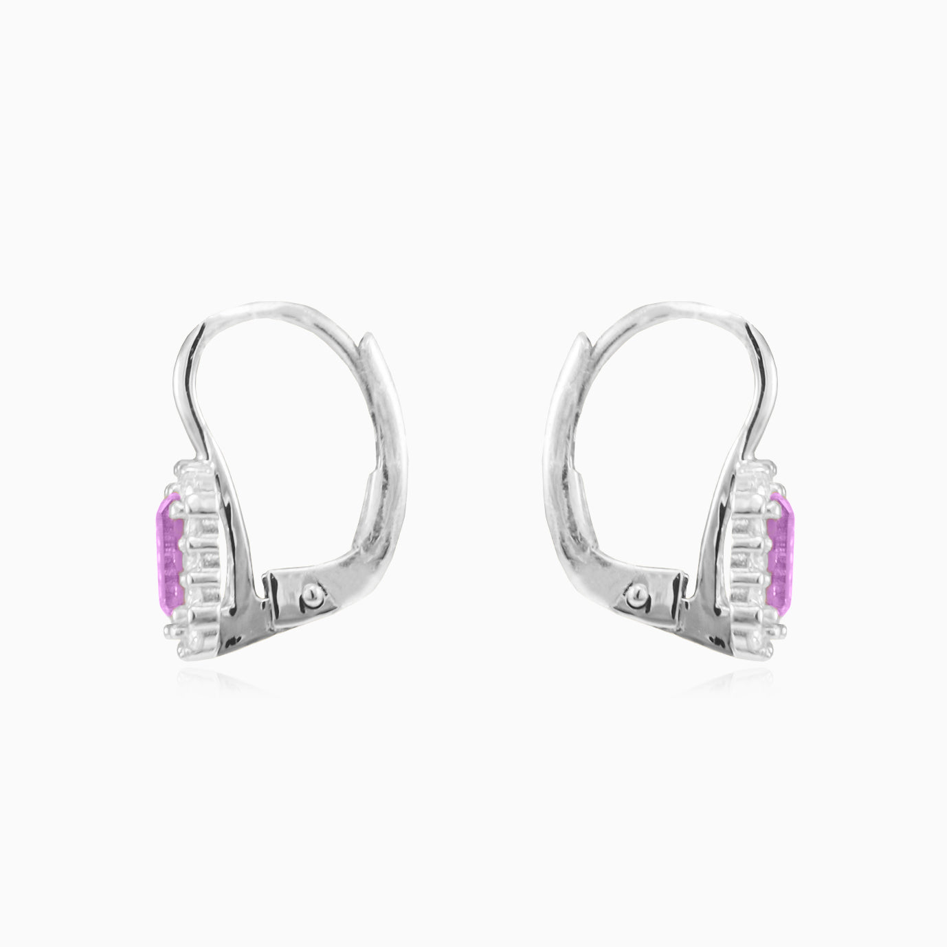 Estos aretes colgantes para mujer en oro blanco de 14 kt muestran una amatista de corte esmeralda en el centro, rodeada de brillantes circonios cúbicos redondos de corte fino escalonado. Engastados con garras y cierre tipo palanca, reflejan una elegancia regia y refinada.