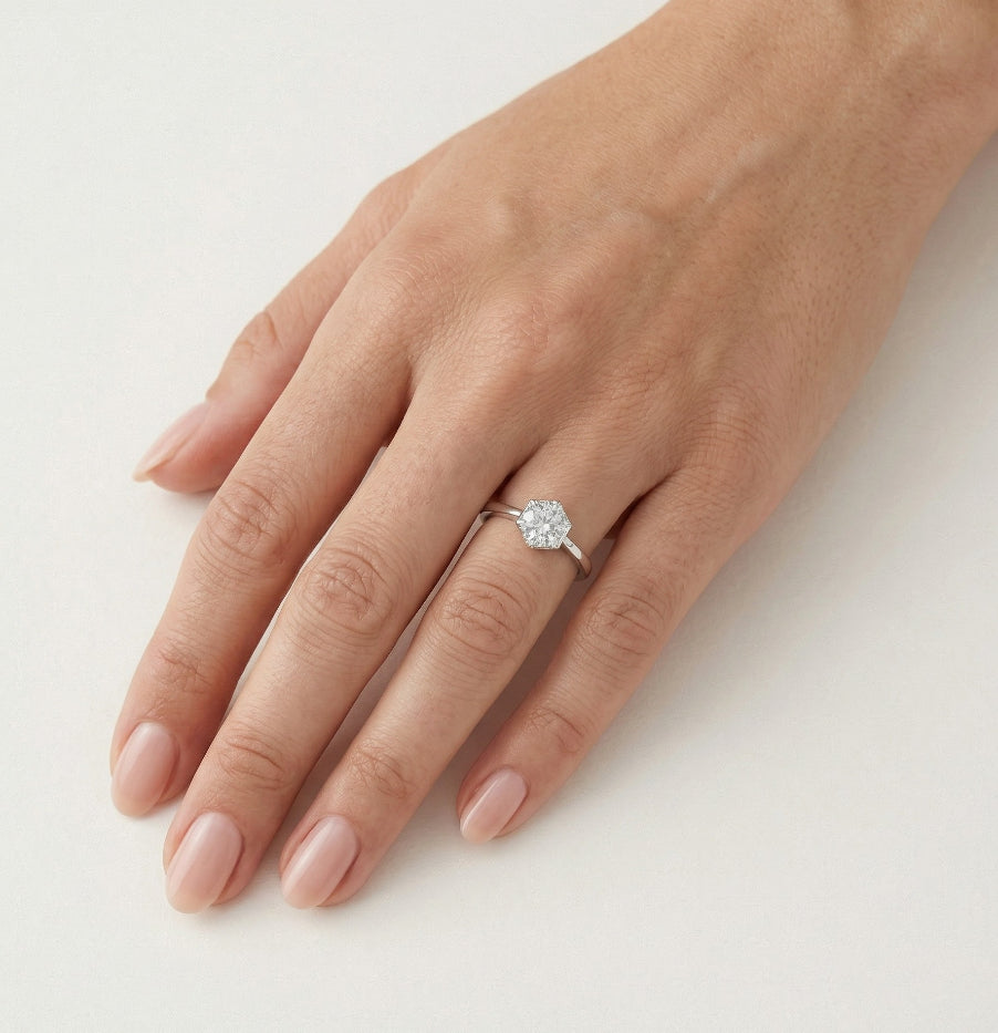 Eleva tu estilo con nuestro anillo de plata que presenta un cautivador diseño hexagonal adornado con brillantes circonitas cúbicas en corte fino redondo, montadas en un clásico engaste de garras.