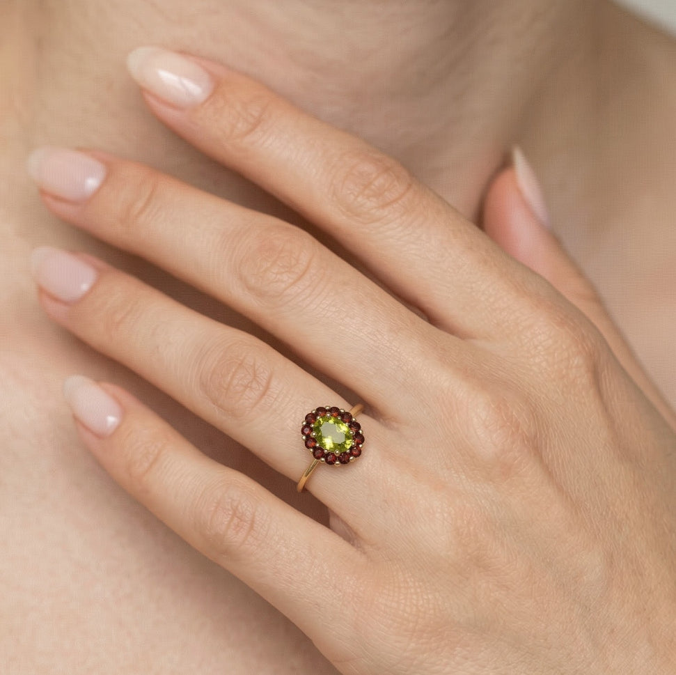Anillo real tesoros de moldavita y granate Anillo real tesoros de moldavita y granate