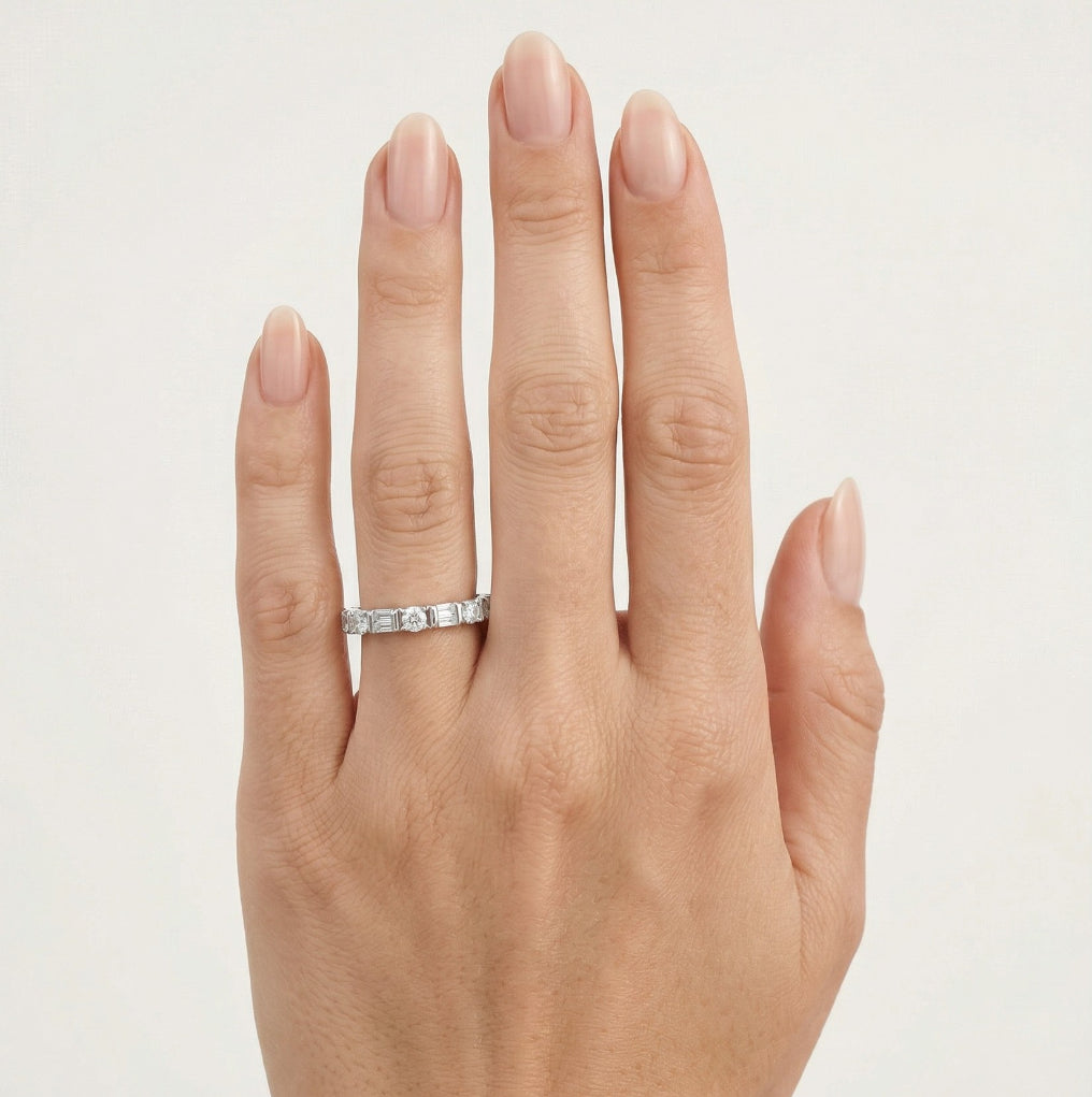 Eleva tu estilo con este elegante anillo de plata para mujer, con piedras de zirconia cúbica en corte escalonado redondo y corte radiante rectangular, engastadas en un ajuste de barra. Perfecto para añadir un toque de brillo a cualquier atuendo.