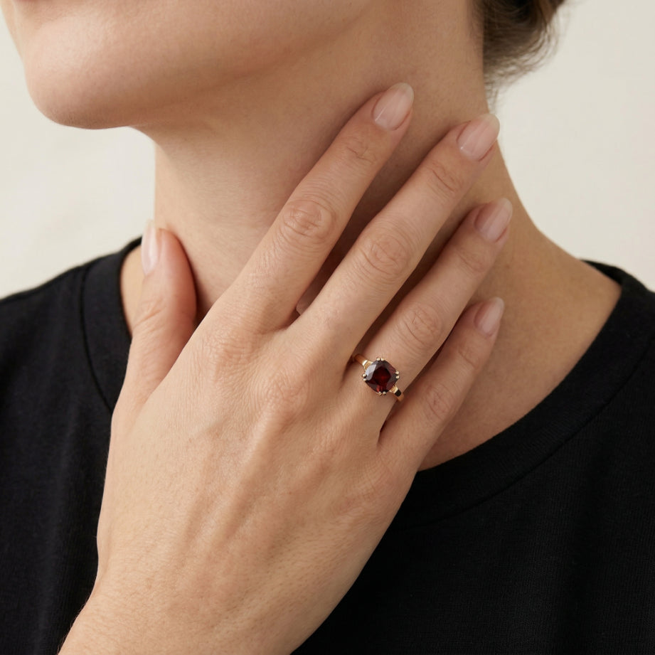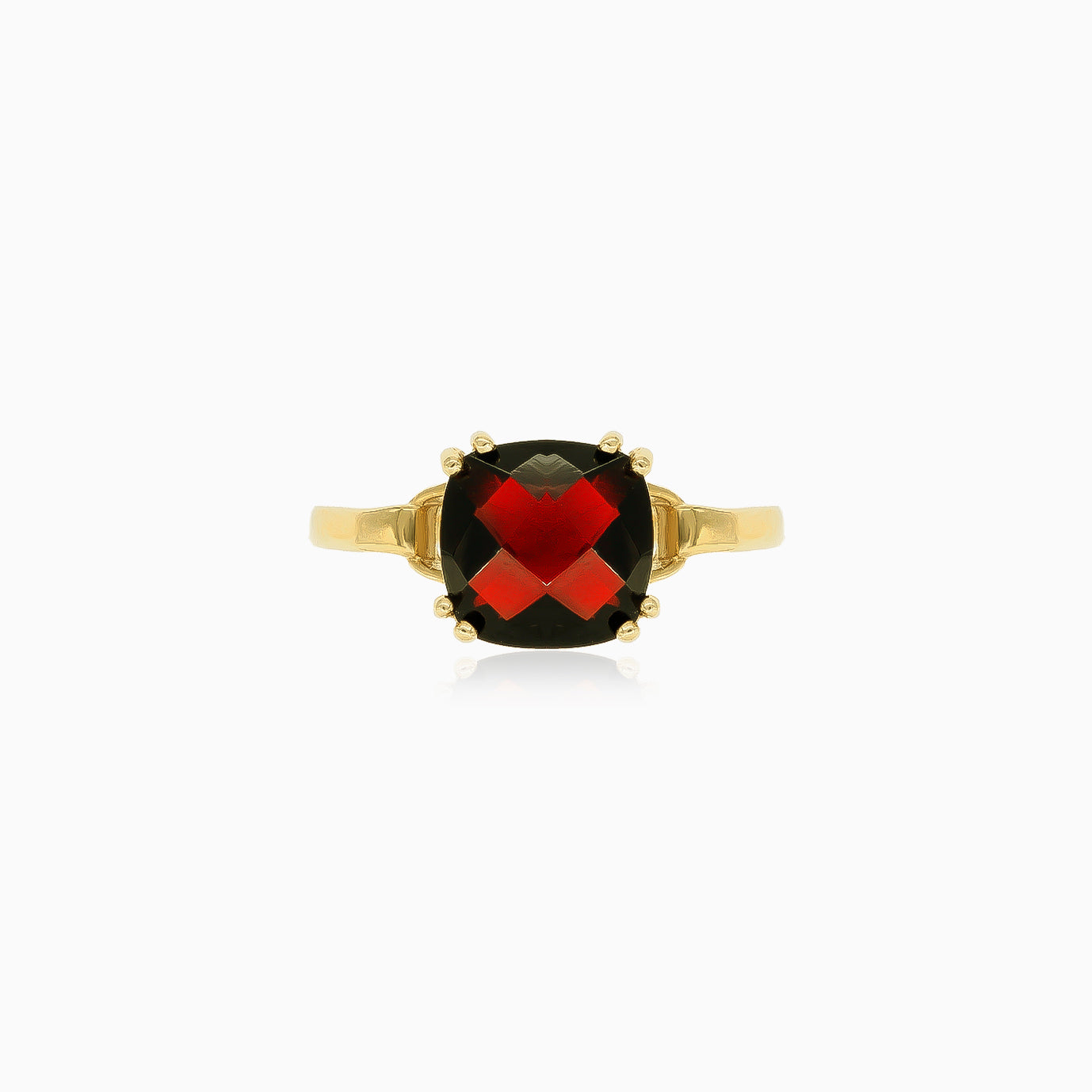 Luce con elegancia con nuestro anillo para mujer con granate en talla cojín escalonada fina, engastado con garras en V en oro amarillo de 14 quilates. Este impresionante anillo añade un toque de sofisticación a cualquier conjunto.