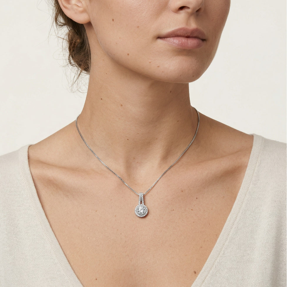 Colgante de oro blanco de 14 quilates, combinado con circonia cúbica central en engaste bisel y un halo de cristales.