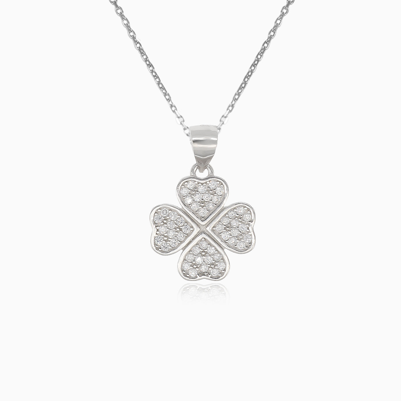 Aporta un toque de suerte y brillo a tu conjunto con este encantador colgante de plata en forma de trébol de cuatro hojas, adornado con relucientes circonitas cúbicas.