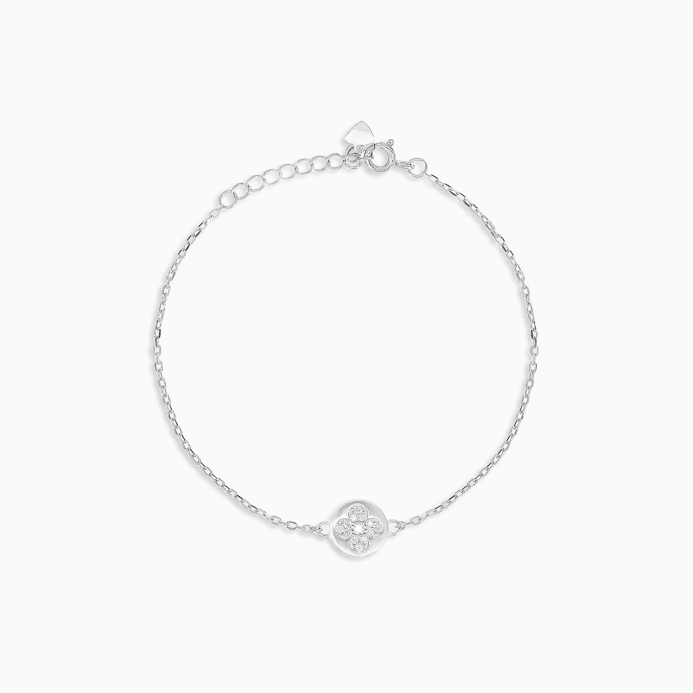 Eleva tu estilo con esta impresionante pulsera de plata que presenta un encantador diseño de hoja de trébol, adornado con piedras de circonita en corte redondo y fino paso, aseguradas con un cierre de anillo a presión.