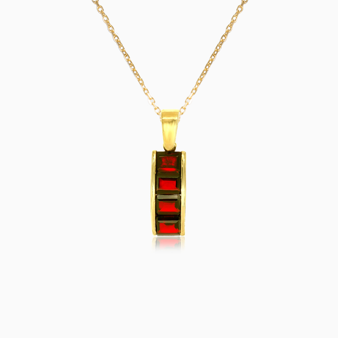 Eleva tu estilo con el resplandor cautivador de nuestro colgante "Radiante Granate". Elaborado en oro amarillo de 14k, presenta cuatro granates en un corte radiante rectangular, delicadamente sujetos con un engaste en canal, convirtiendo este colgante en una adición atemporal a tu colección.