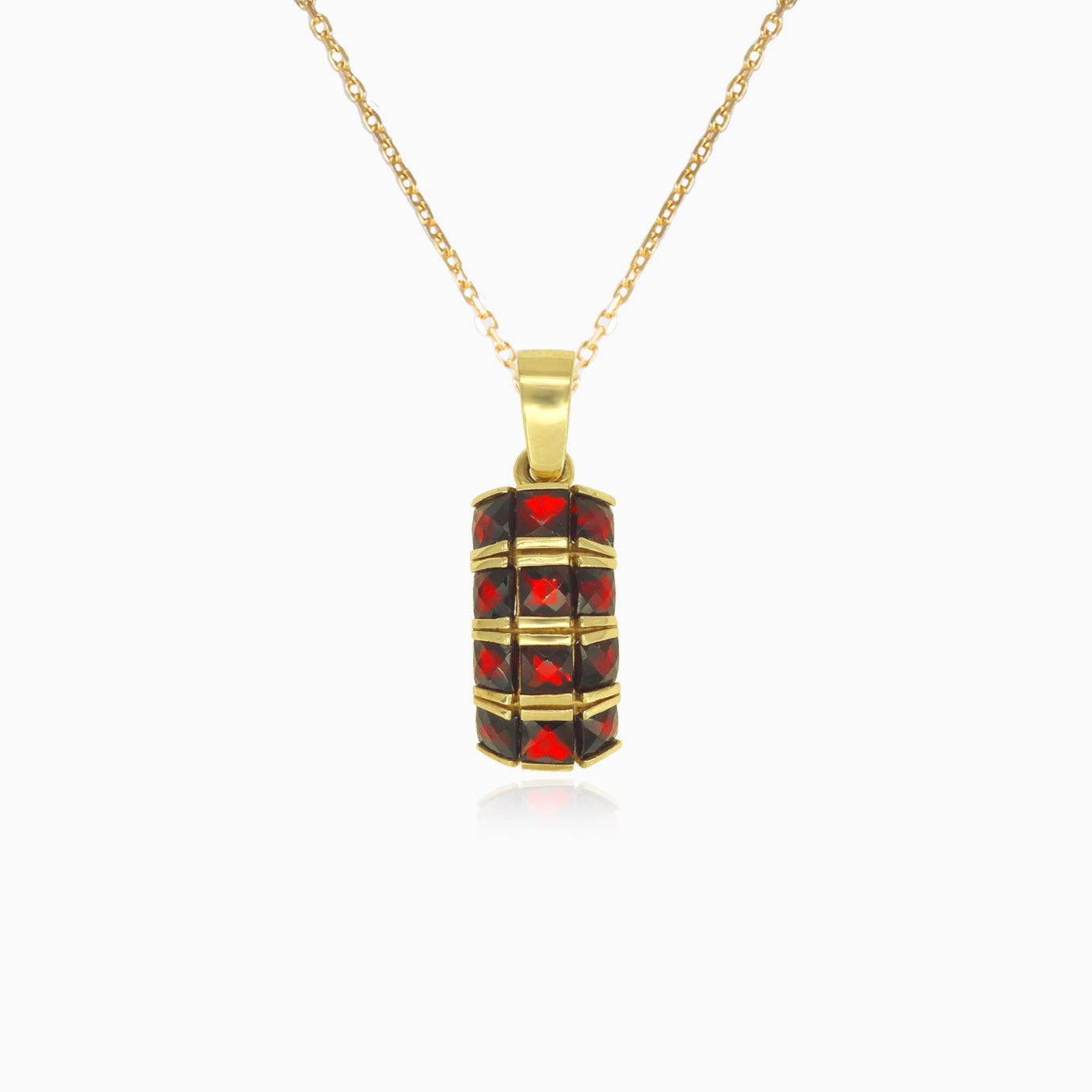 Este audaz colgante de oro amarillo de 14 quilates para mujer presenta tres filas de granates de corte princesa cuadrado, engastados de manera segura en un engaste de barra. Los ricos granates rojos y el diseño masivo y elegante hacen de este colgante una pieza destacada, perfecta para quienes buscan lujo y belleza llamativa.