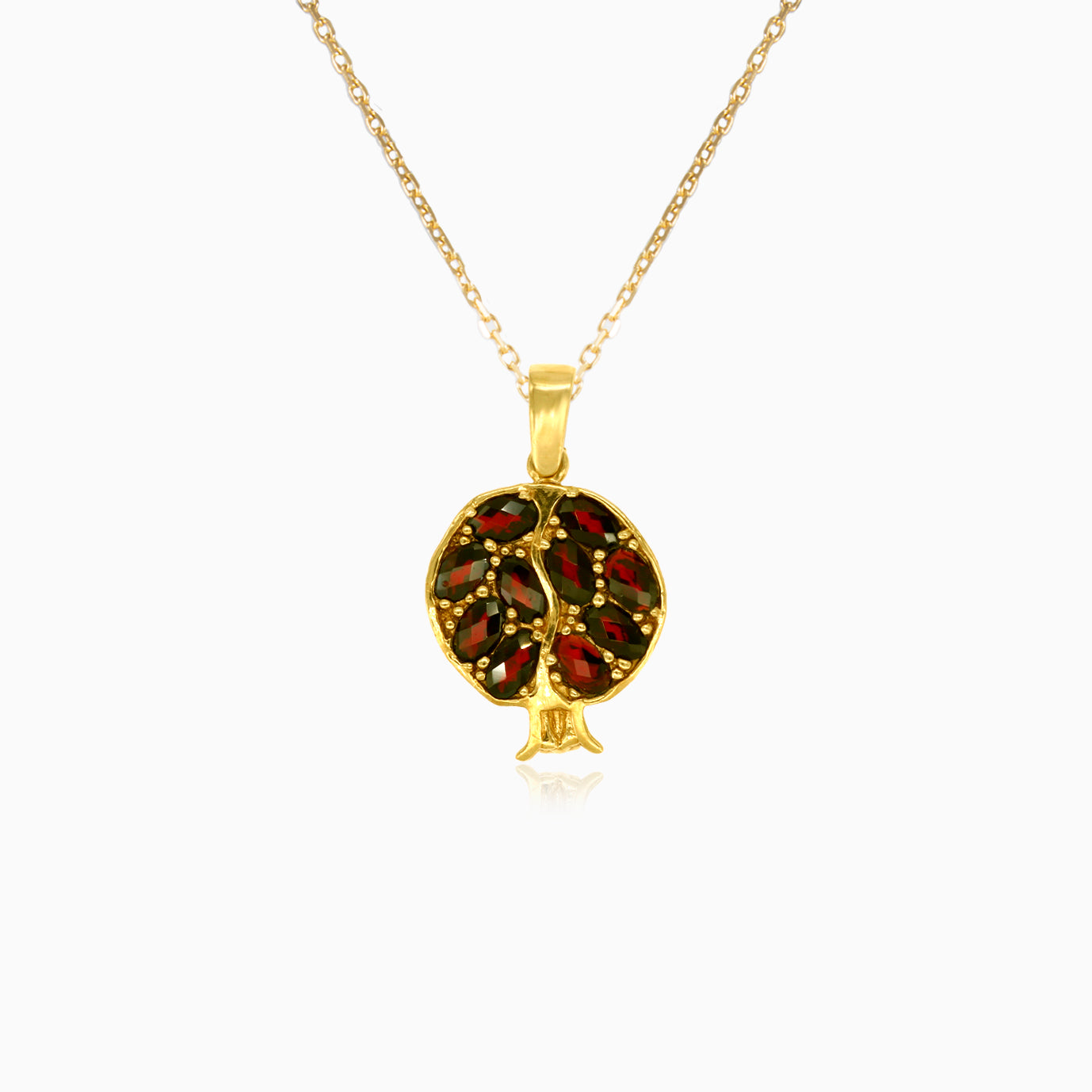 Abraza la sofisticación con este colgante de oro amarillo 14kt en forma de granada, con una piedra de granate en corte fino ovalado. El colgante cuenta con un engaste de 4 garras, garantizando una adición atemporal y elegante a tu colección de joyas.