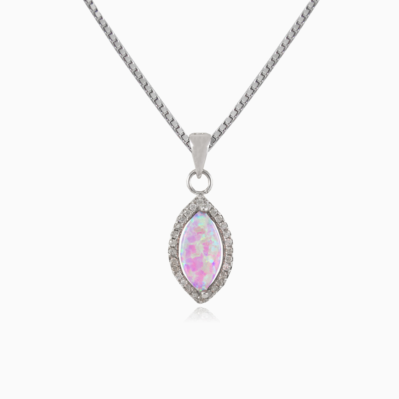 Colgante de plata de ley para mujer con ópalo rosa en talla marquesa y halo de circonitas cúbicas.