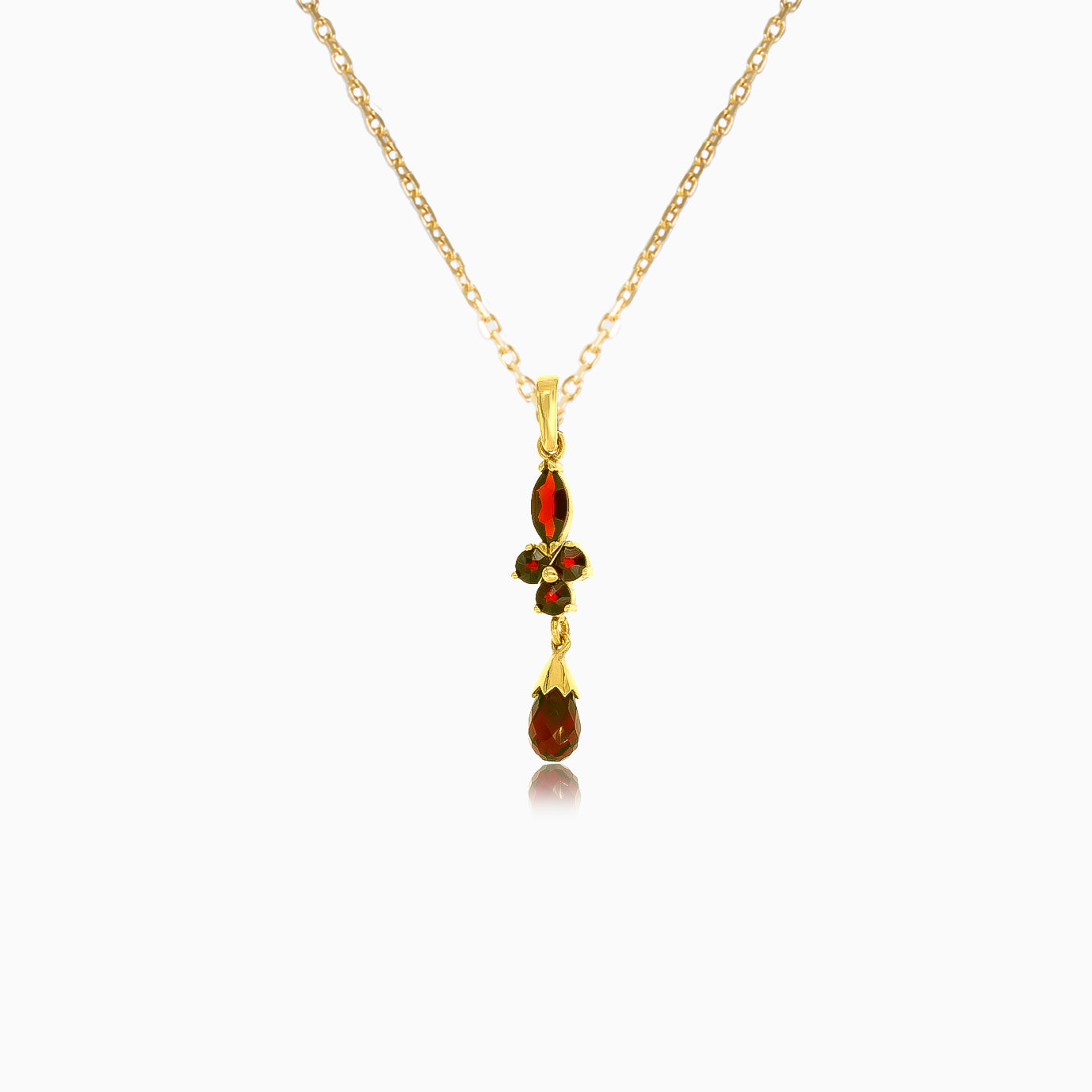 Disfruta del encanto opulento con este colgante de gota en oro amarillo de 14 kt que presenta un trío de piedras granate, incluyendo un corte pera briollette, un corte redondo y un corte marquesa escalonado fino. El engaste compartido con garras asegura estilo y comodidad para cualquier ocasión.