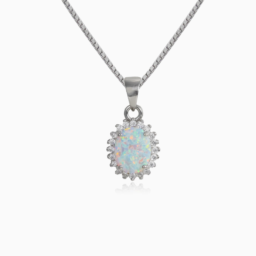 Colgante de diseño clásico real en plata de ley combinado con ópalo blanco de talla ovalada y halo de circonia cúbica blanca.