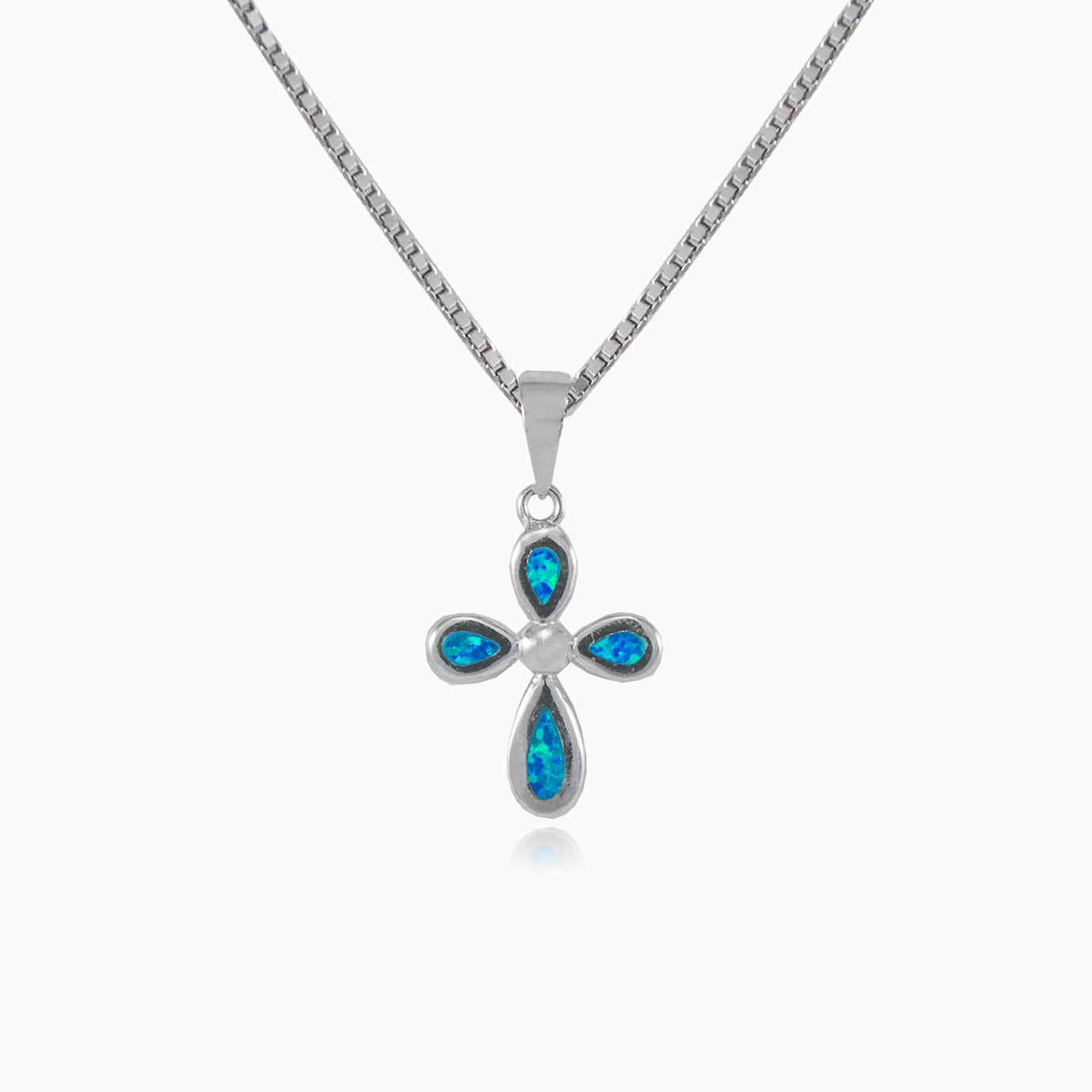 Colgante en forma de cruz de plata de ley para mujer combinado con pasta de esmalte blanco y azul en la parte superior.