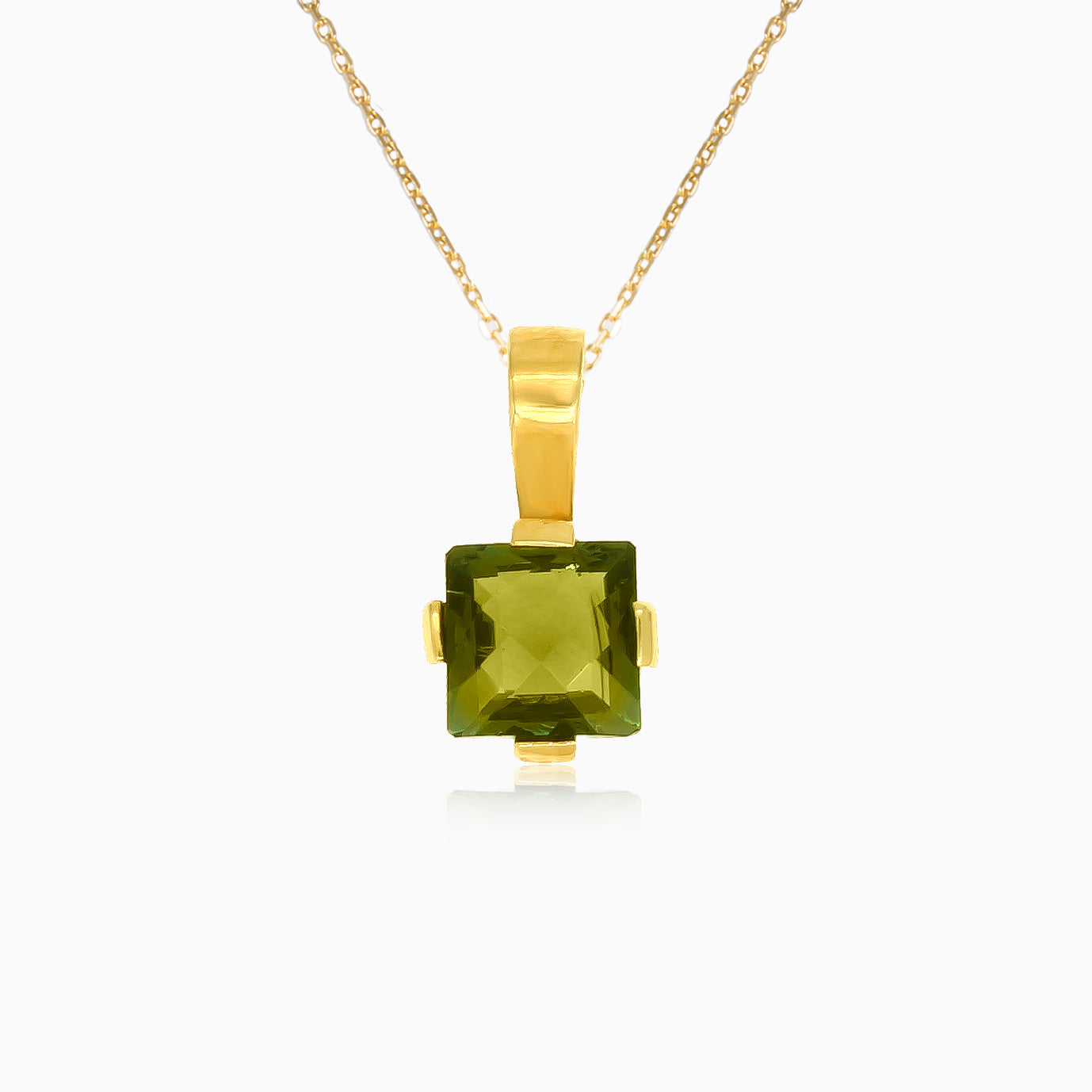 Abraza el atractivo celestial con nuestro colgante de oro amarillo de 14 quilates que presenta una cautivadora moldavita en corte princesa cuadrado. El diseño moderno y elegante se realza con un engaste en barra, creando una pieza única y sofisticada de joyería.