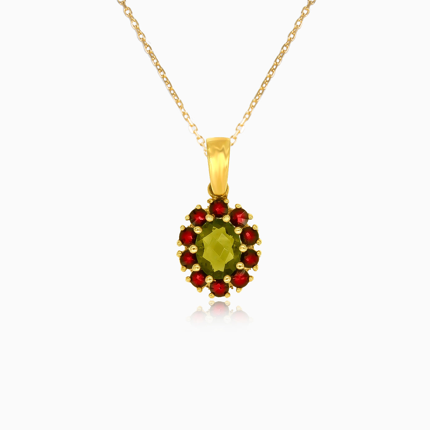 Explora la sofisticación con este colgante de oro amarillo de 14 quilates que presenta moldavita y granate ovalados de corte escalonado fino en un ajuste de garras compartidas. Los cautivadores tonos verdes y rojos añaden un toque de lujo a tu conjunto.
